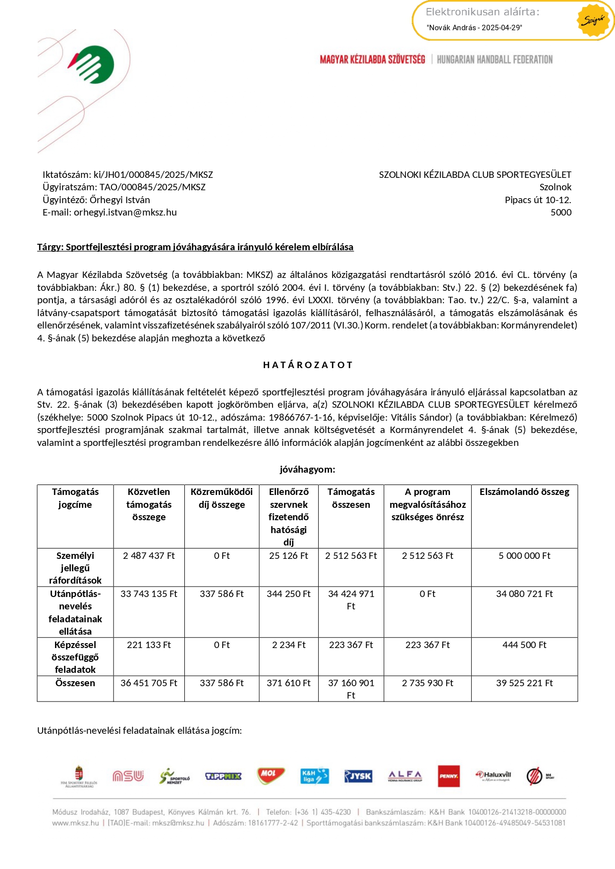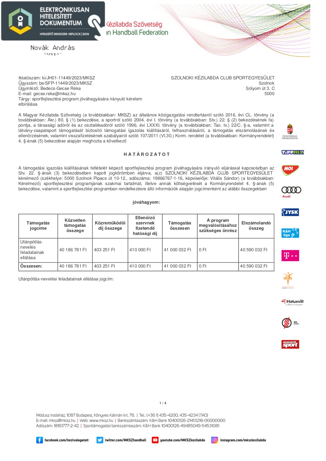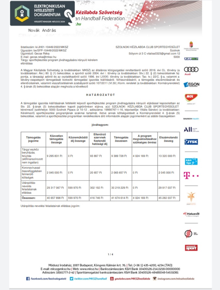 A Szolnoki Kézilabda Club Sportegyesület elnyert támogatása a 2022/2023-es szezonra