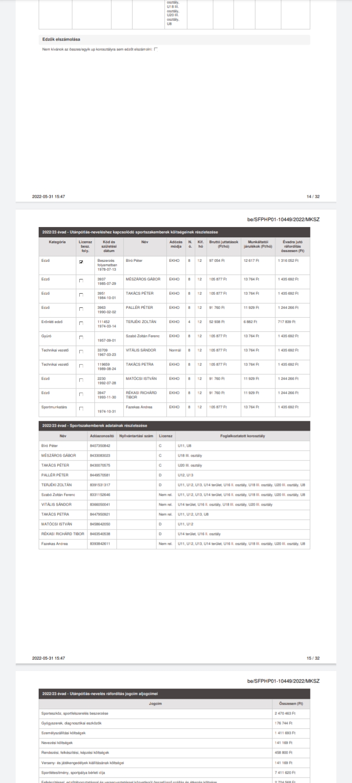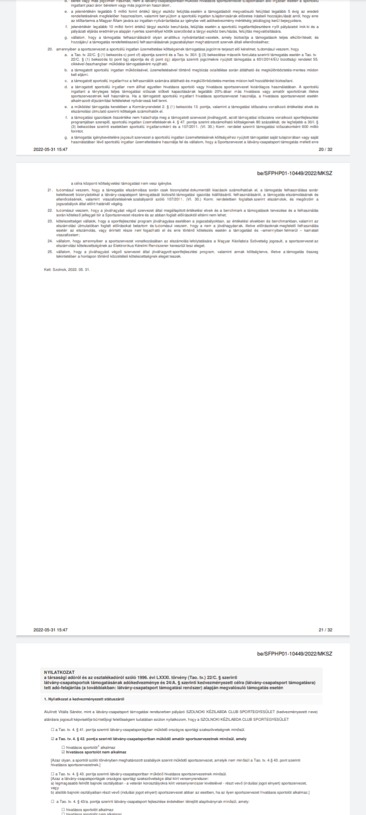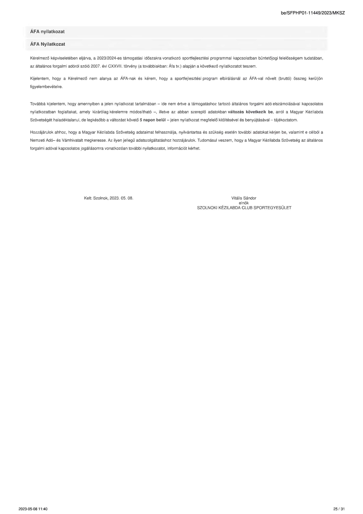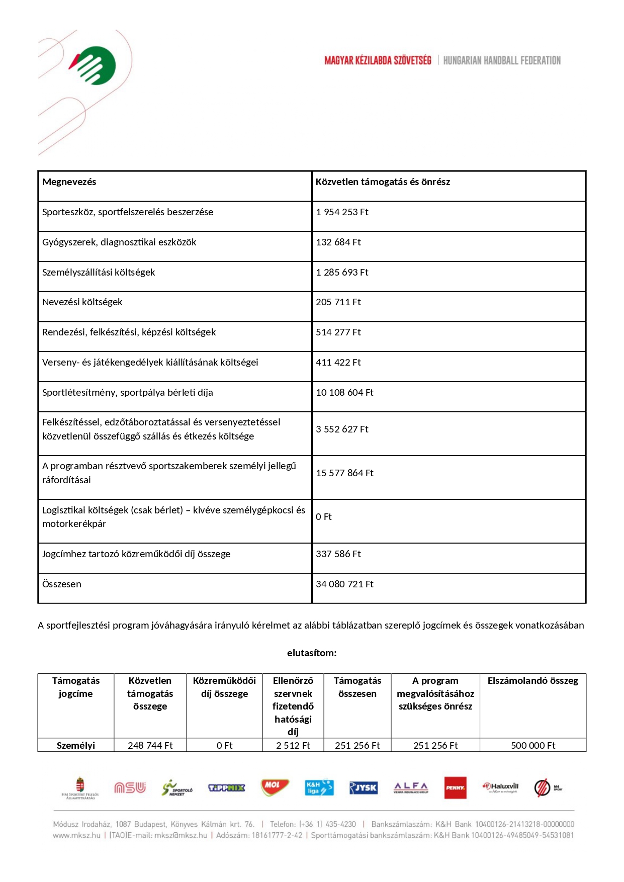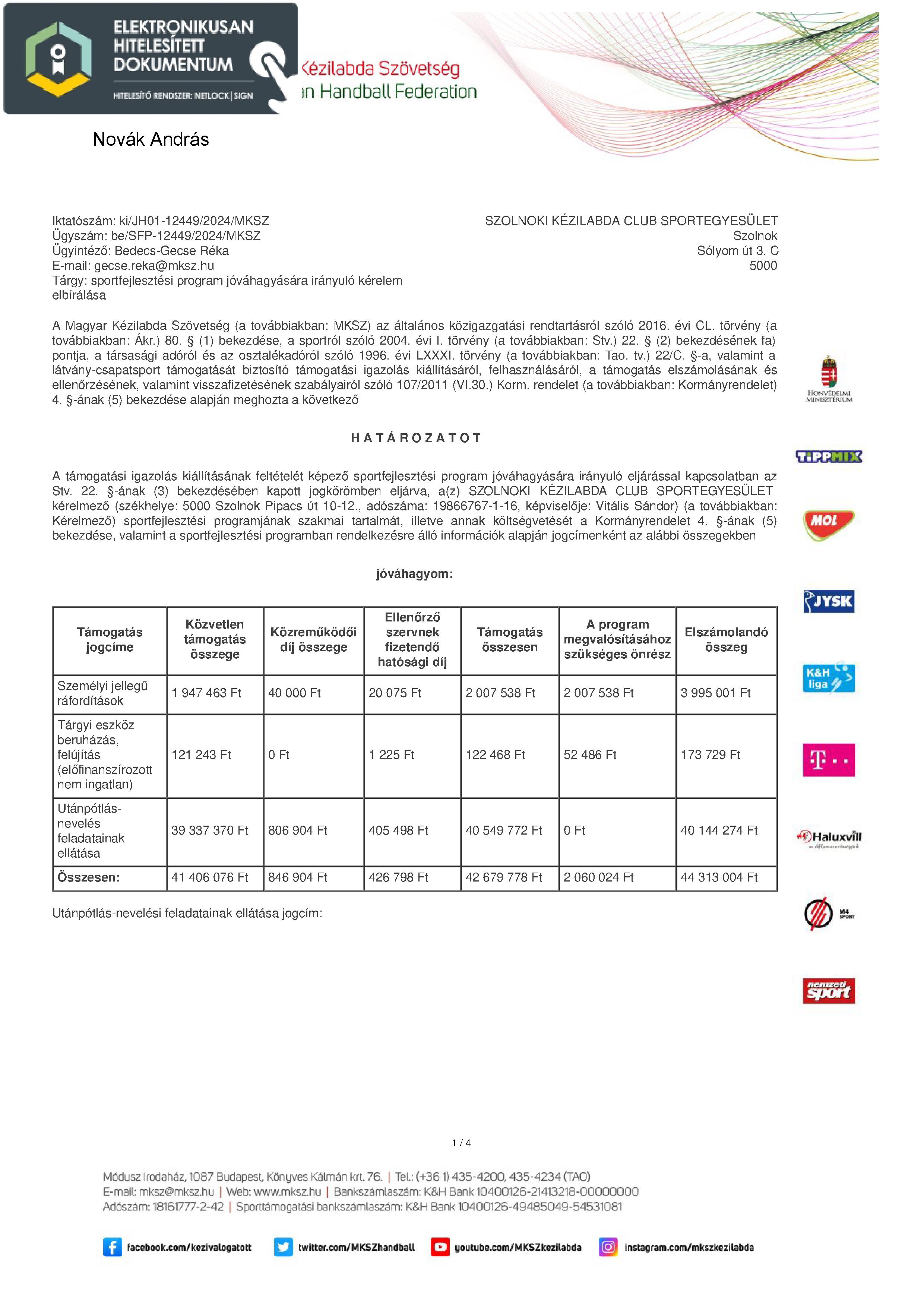 A támogatási igazolás kiállításának feltételét képező sportfejlesztési program jóváhagyására irányuló eljárással kapcsolatban a Szolnoki Kézilabda Club Sportegyesület kérelmező (5000 Szolnok Pipacs u. 10-12., adószáma: 19866767 - 1 - 16, képviselője: Vitális Sándor) sportfejlesztési programjának szakmai tartalmát, illetve annak költségvetését a Kormányrendelet 4. §-ának (5) bekezdése, valamint a sportfejlesztési programban rendelkezésre álló információk alapján jogcímenként az alábbi összegekben jóváhagyta: