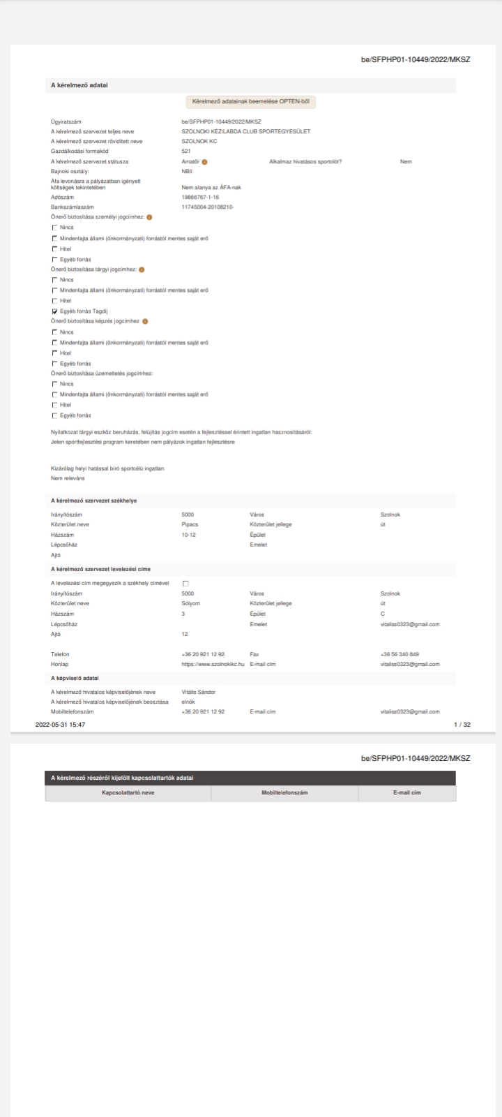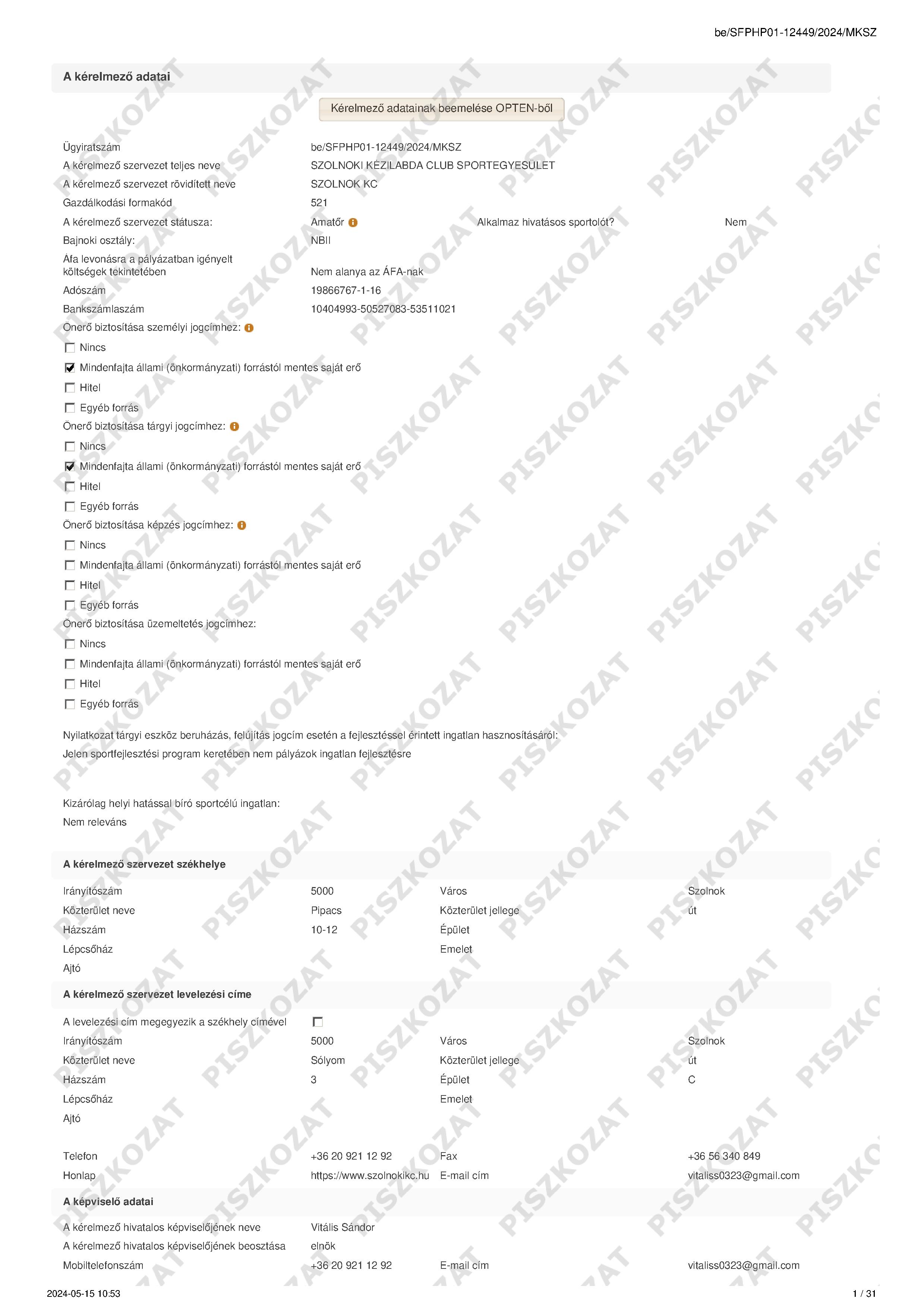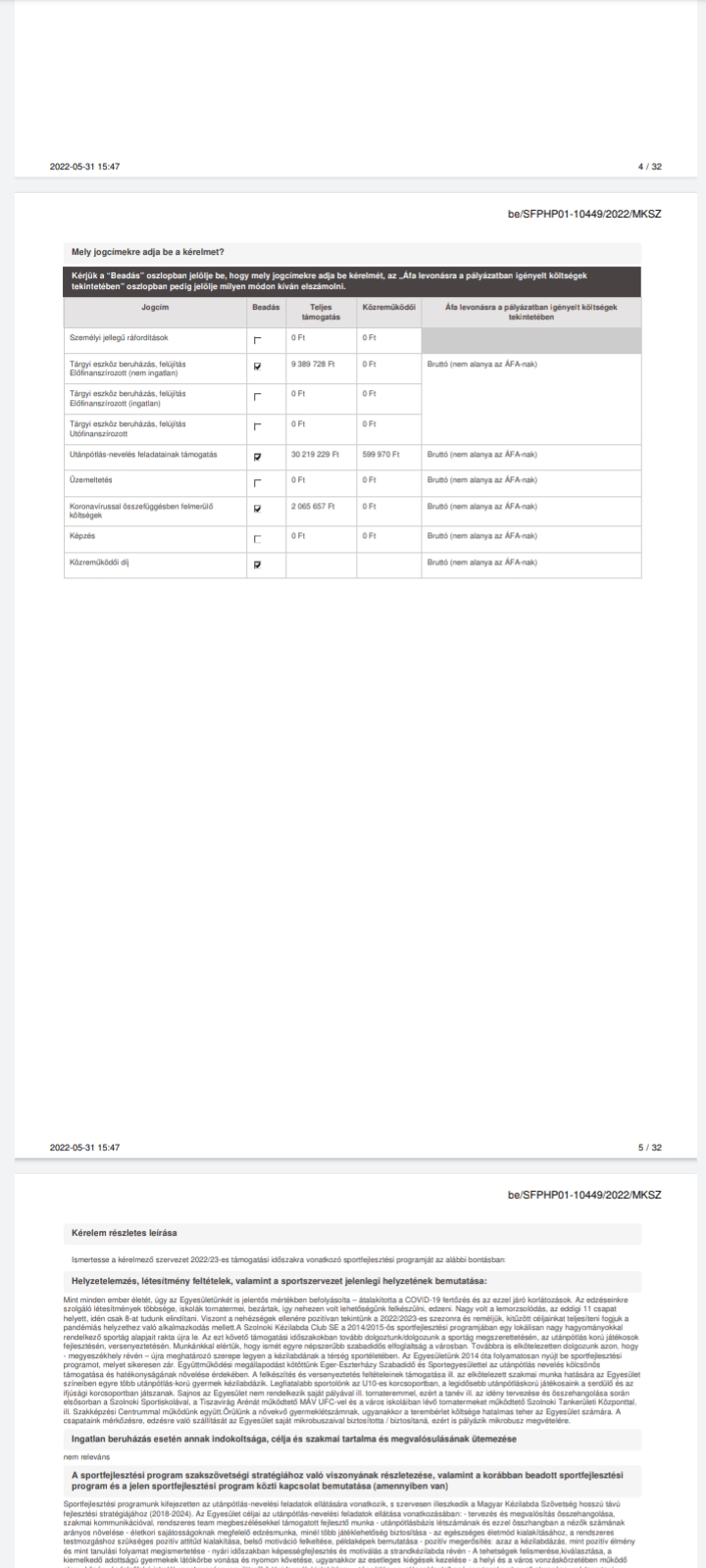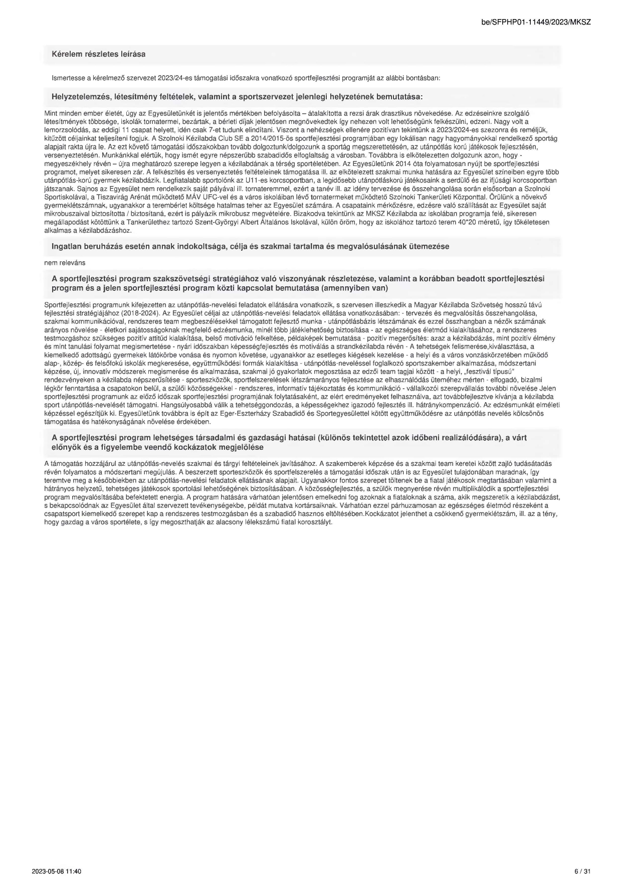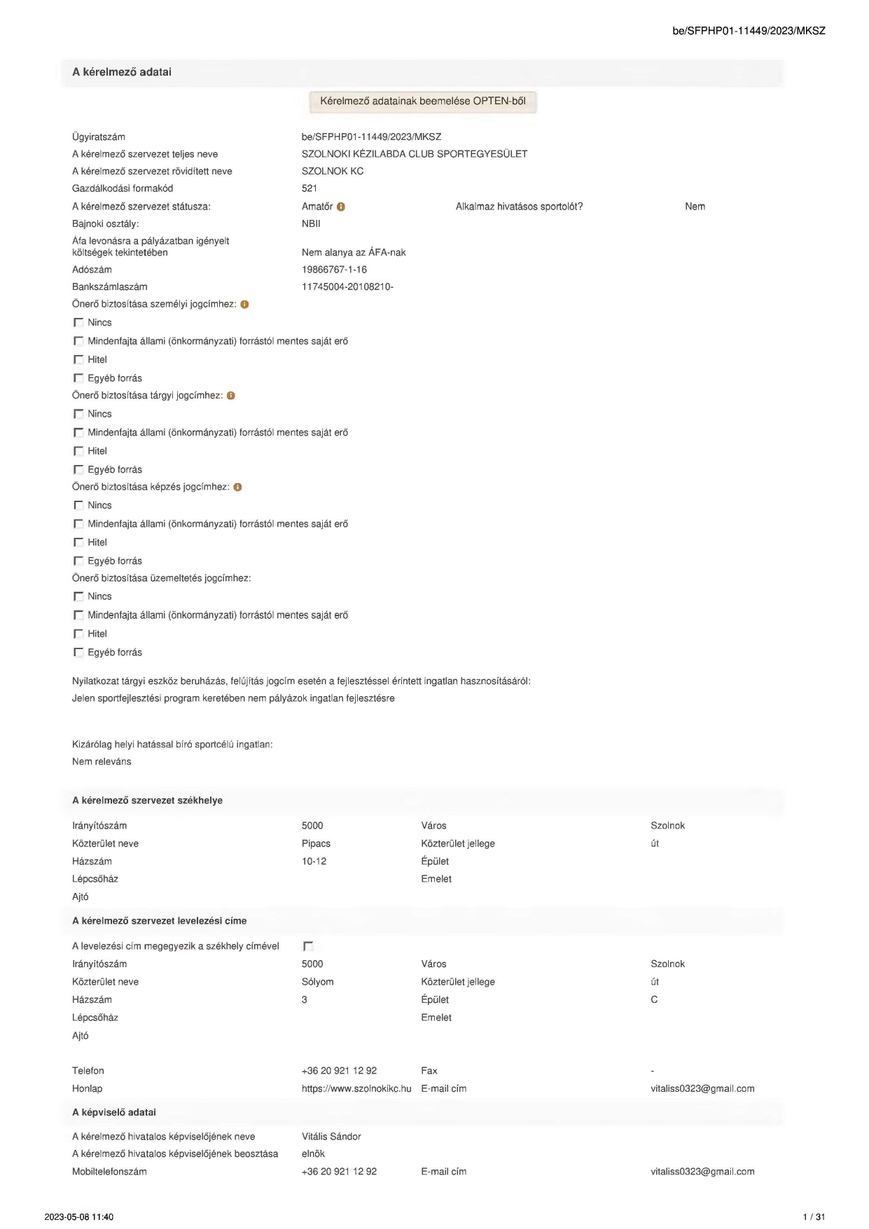 A támogatási igazolás kiállításának feltételét képező sportfejlesztési program jóváhagyására irányuló eljárással kapcsolatban a Szolnoki Kézilabda Club Sportegyesület kérelmező (5000 Szolnok Pipacs u. 10-12., adószáma: 19866767 - 1 - 16, képviselője: Vitális Sándor) sportfejlesztési programjának szakmai tartalmát, illetve annak költségvetését a Kormányrendelet 4. §-ának (5) bekezdése, valamint a sportfejlesztési programban rendelkezésre álló információk alapján jogcímenként az alábbi összegekben jóváhagyta: