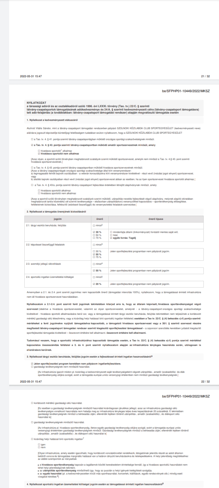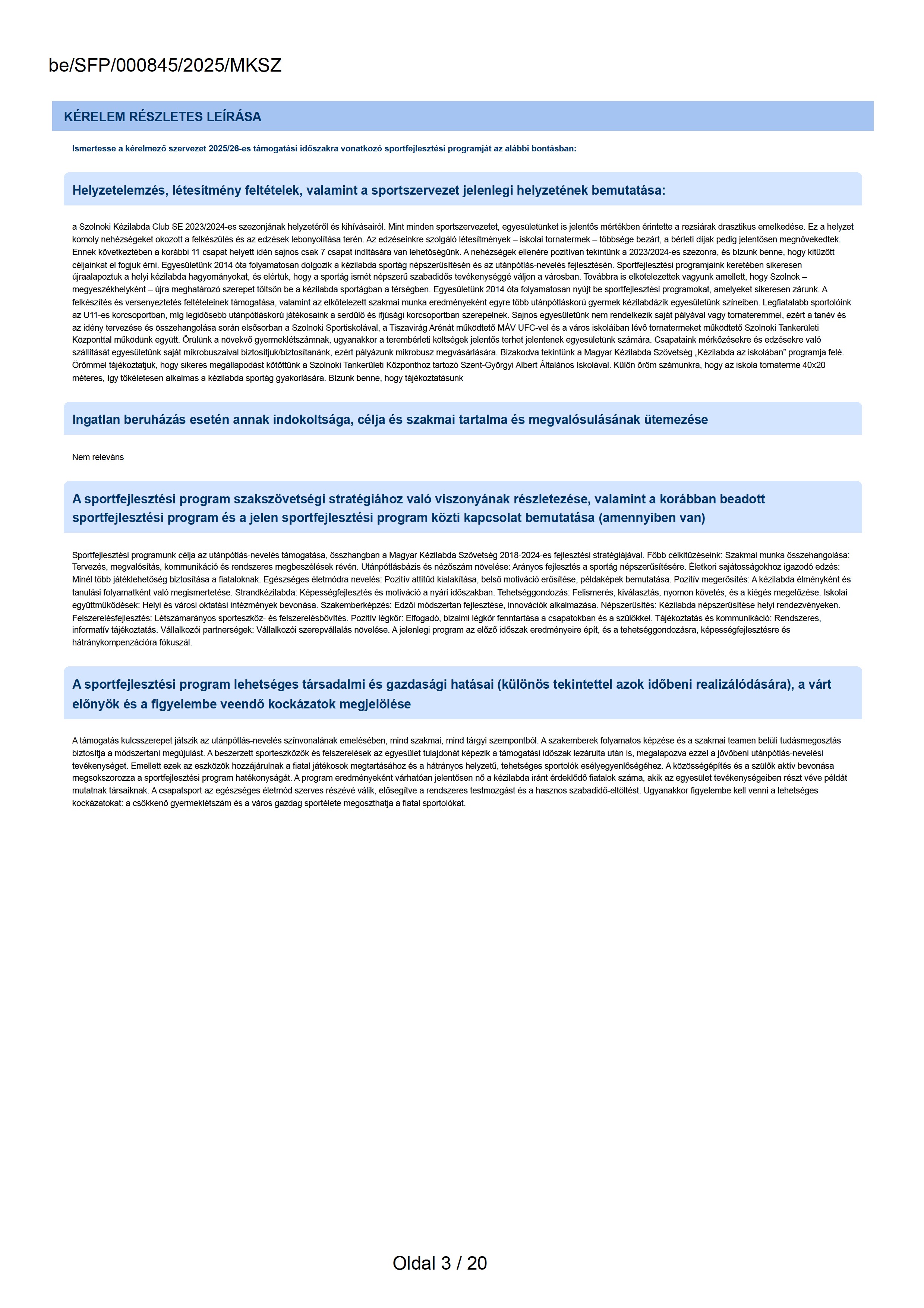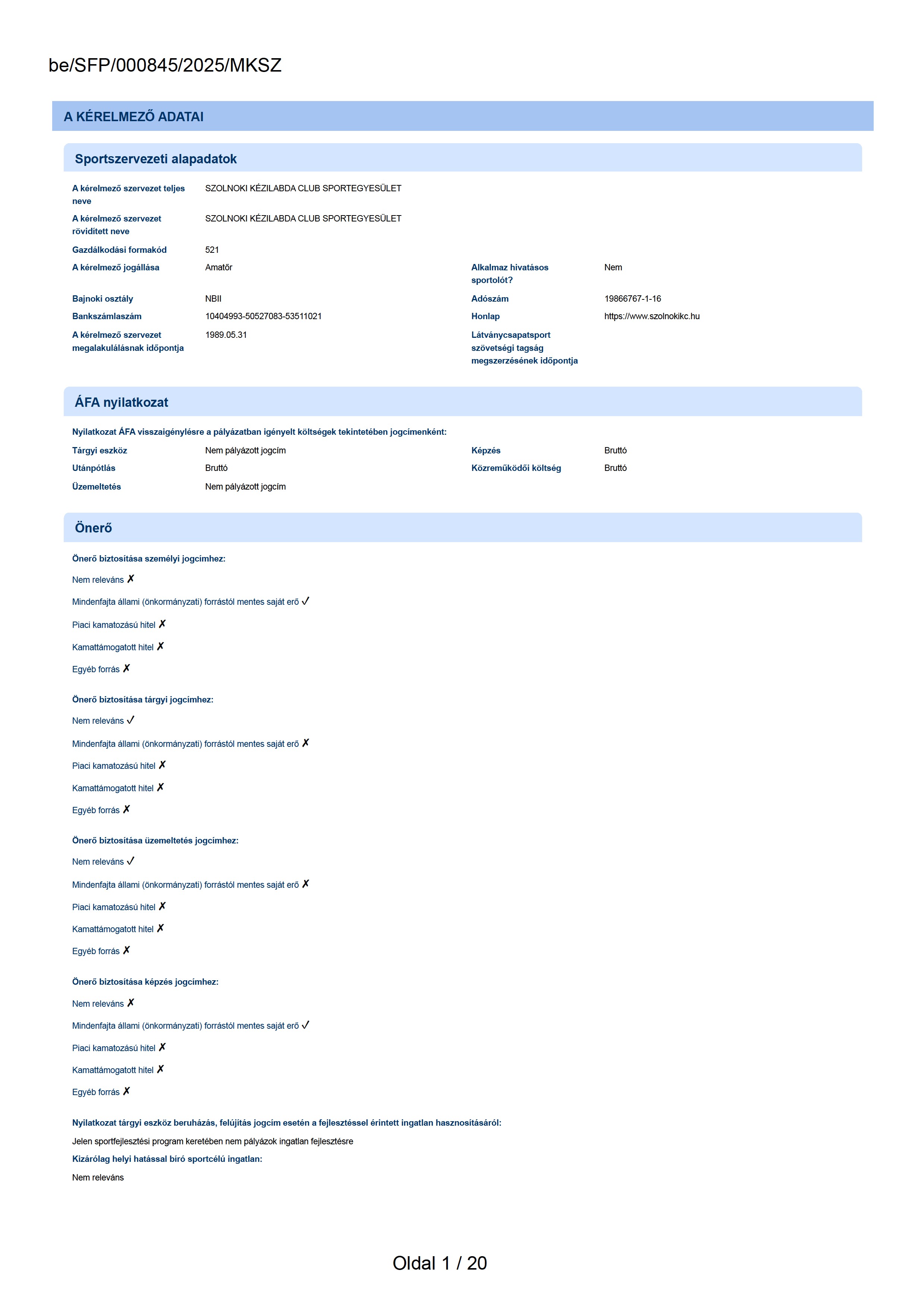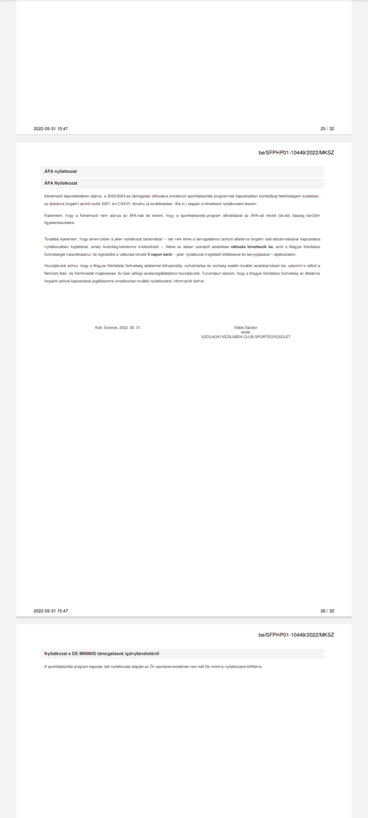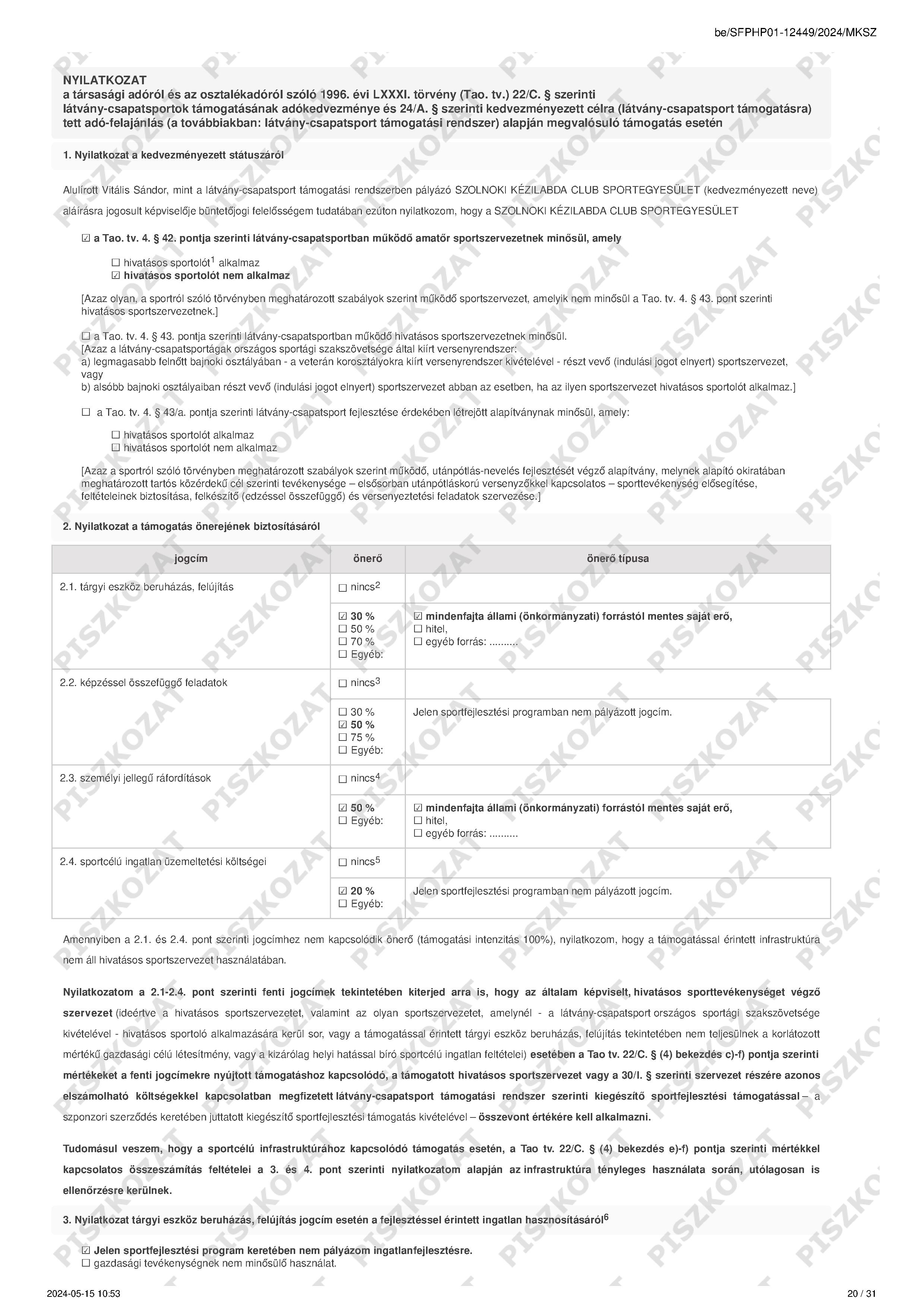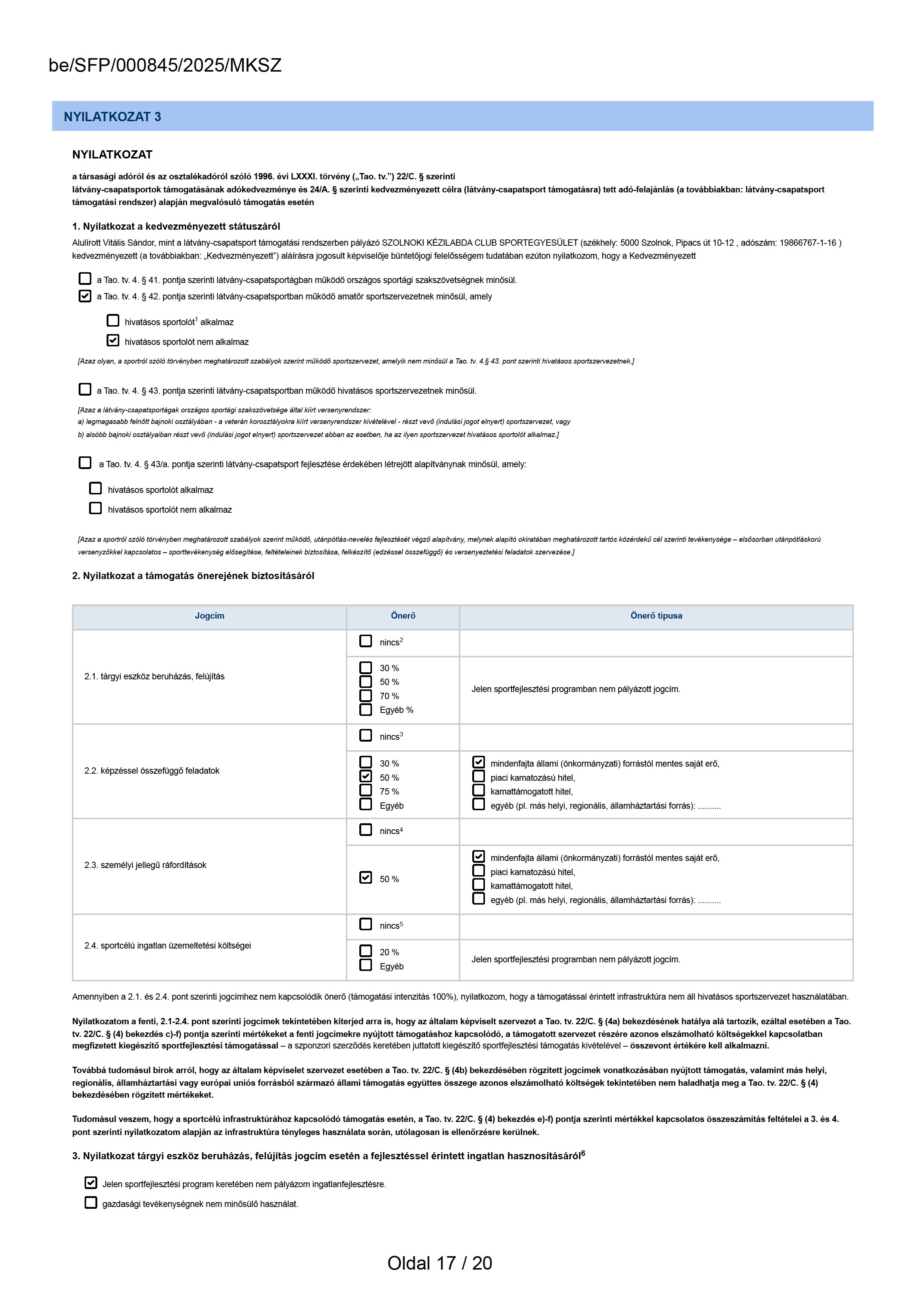 A támogatási igazolás kiállításának feltételét képező sportfejlesztési program jóváhagyására irányuló eljárással kapcsolatban a Szolnoki Kézilabda Club Sportegyesület kérelmező (5000 Szolnok Pipacs u. 10-12., adószáma: 19866767 - 1 - 16, képviselője: Vitális Sándor) sportfejlesztési programjának szakmai tartalmát, illetve annak költségvetését a Kormányrendelet 4. §-ának (5) bekezdése, valamint a sportfejlesztési programban rendelkezésre álló információk alapján jogcímenként az alábbi összegekben jóváhagyta: