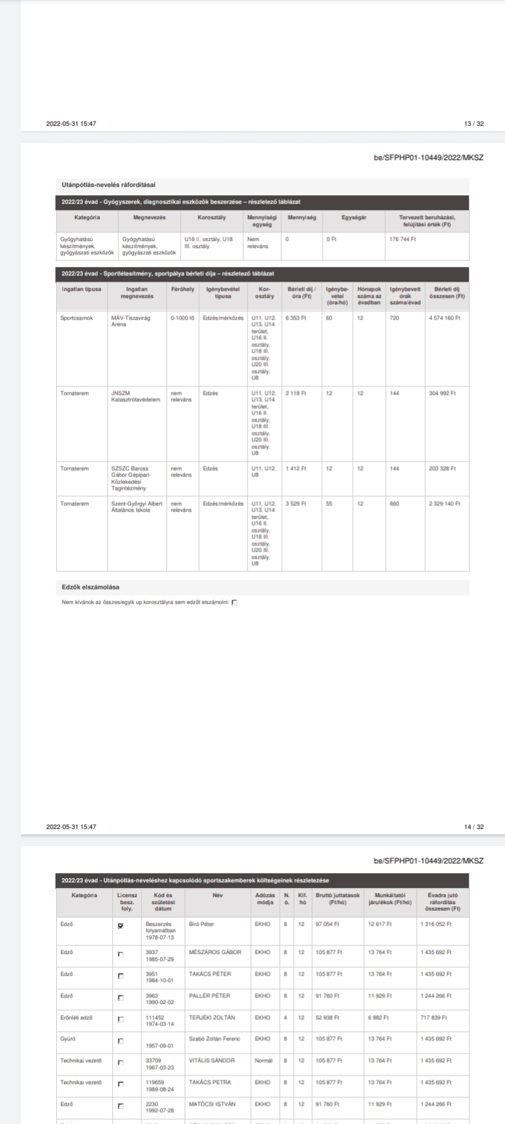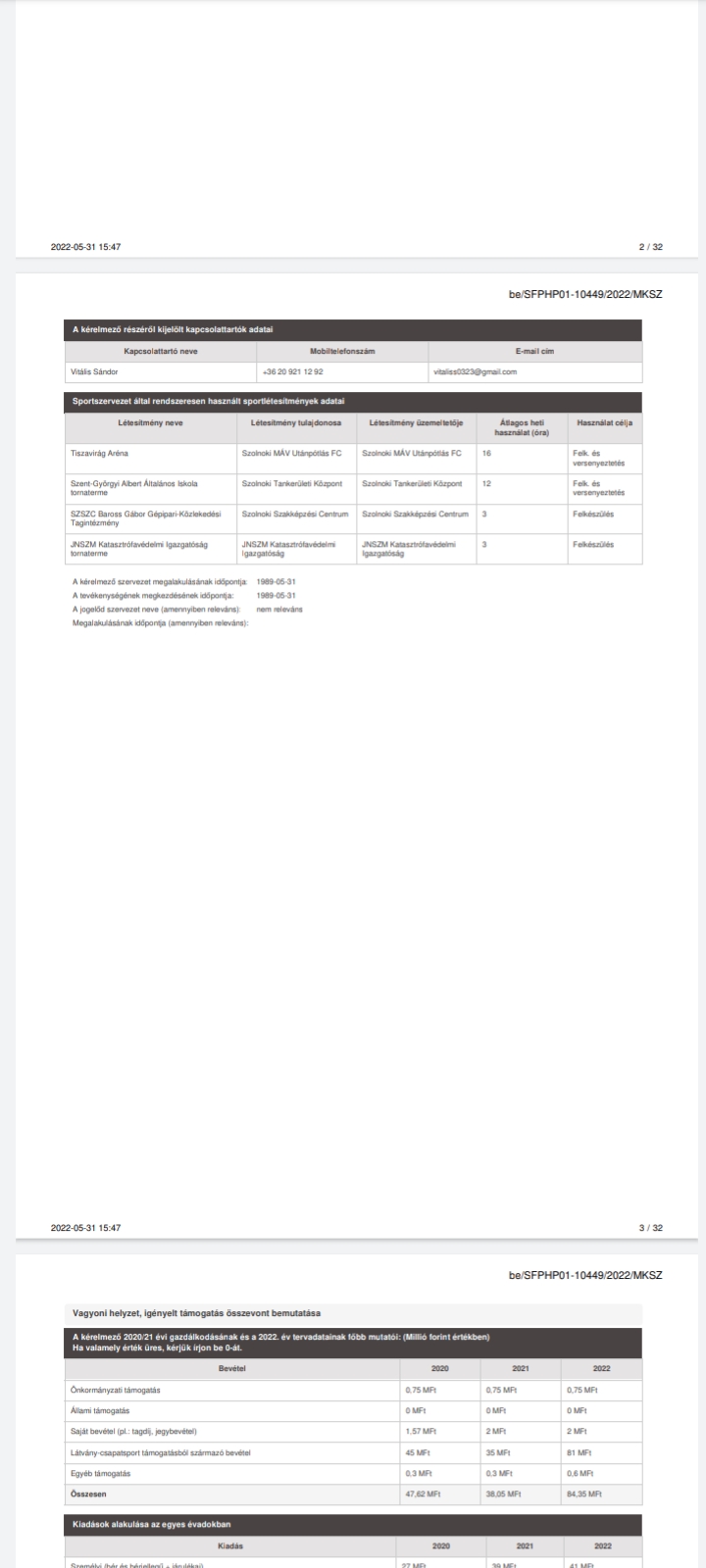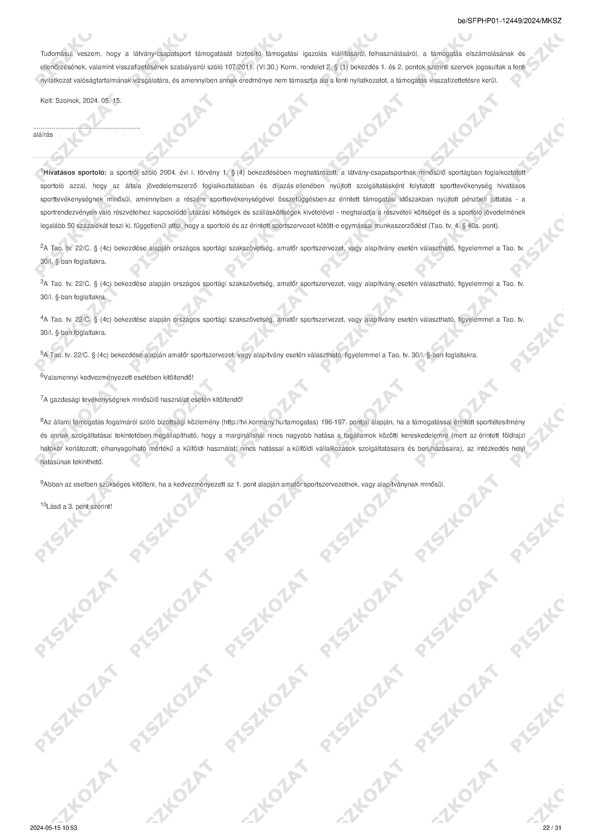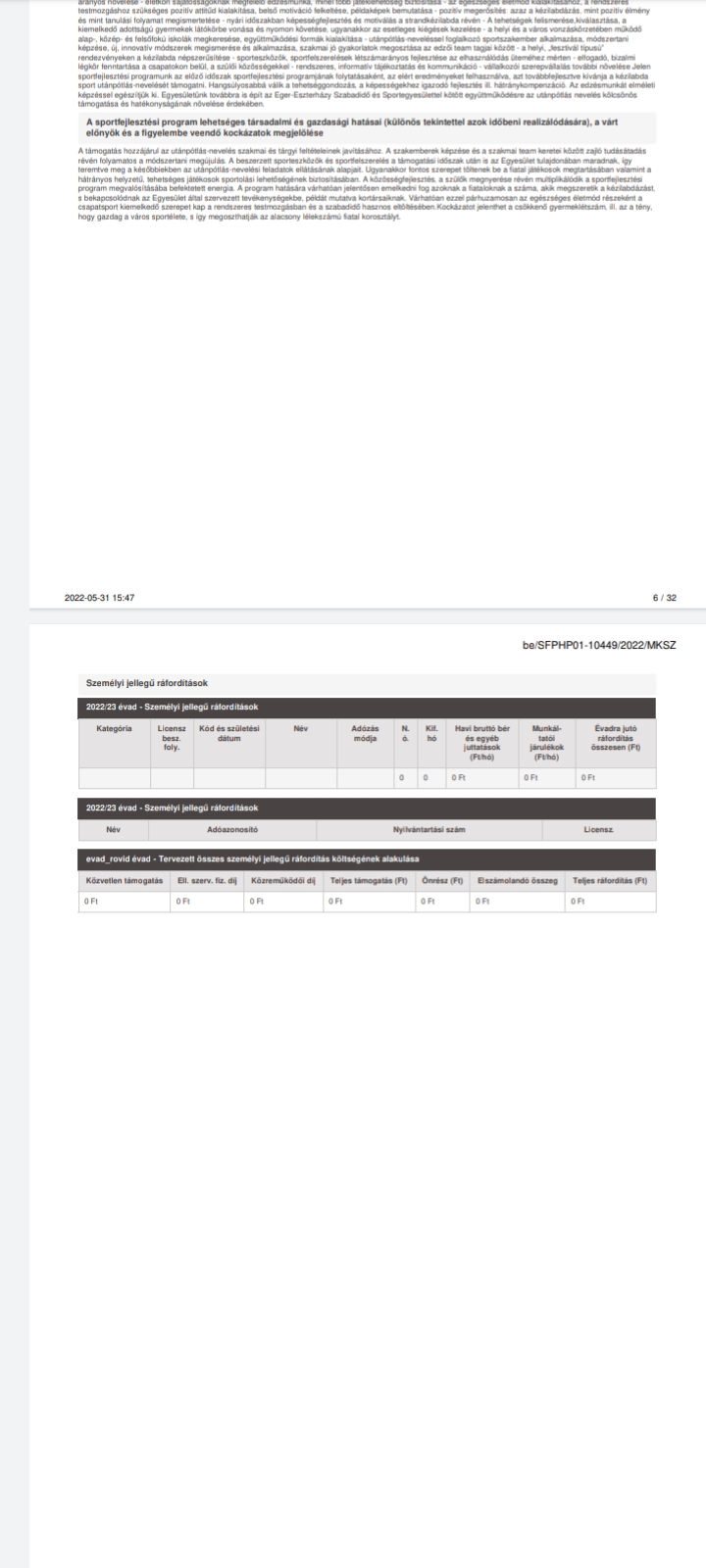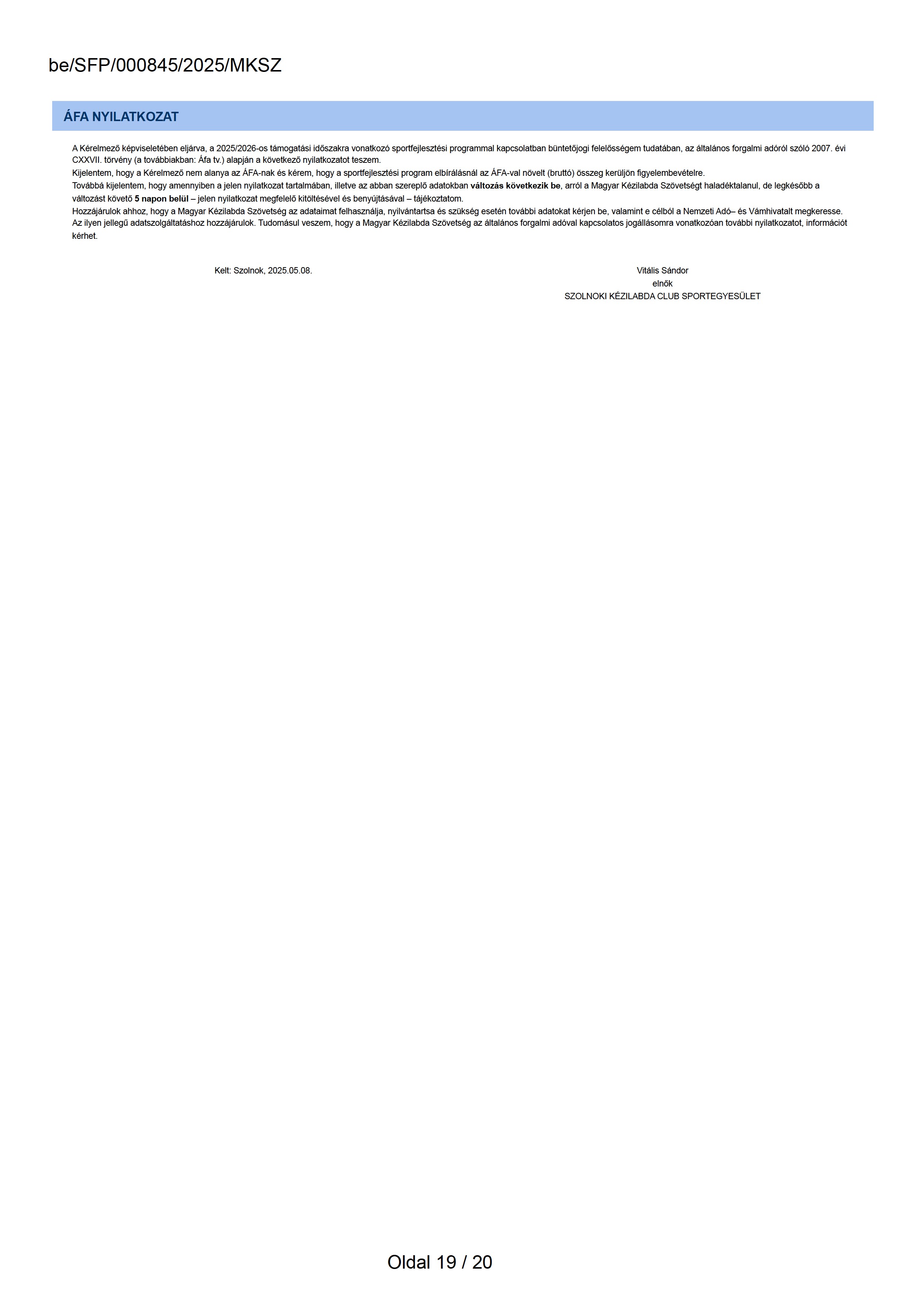 A támogatási igazolás kiállításának feltételét képező sportfejlesztési program jóváhagyására irányuló eljárással kapcsolatban a Szolnoki Kézilabda Club Sportegyesület kérelmező (5000 Szolnok Pipacs u. 10-12., adószáma: 19866767 - 1 - 16, képviselője: Vitális Sándor) sportfejlesztési programjának szakmai tartalmát, illetve annak költségvetését a Kormányrendelet 4. §-ának (5) bekezdése, valamint a sportfejlesztési programban rendelkezésre álló információk alapján jogcímenként az alábbi összegekben jóváhagyta: