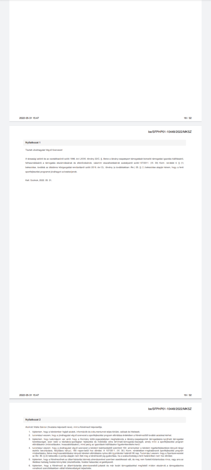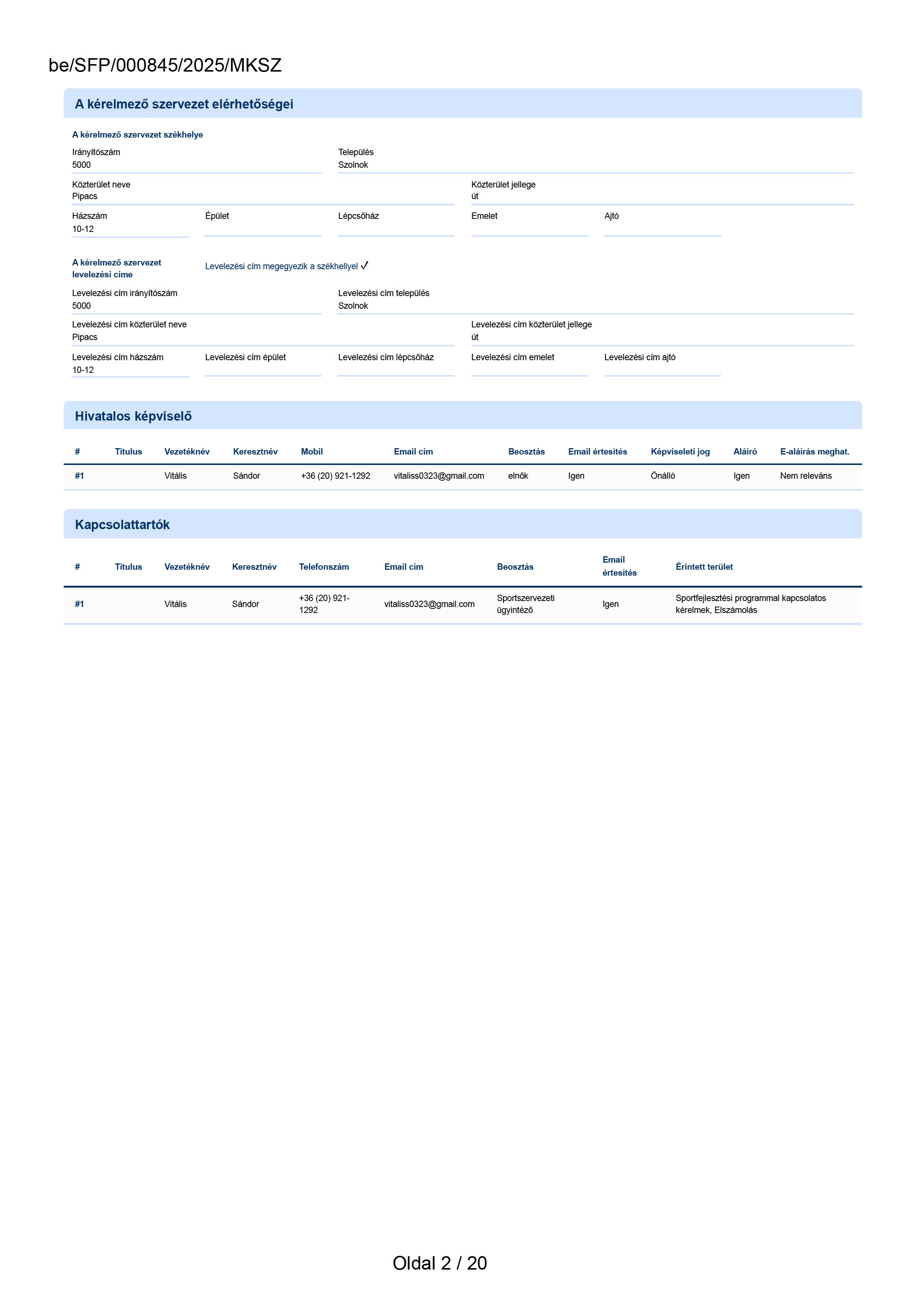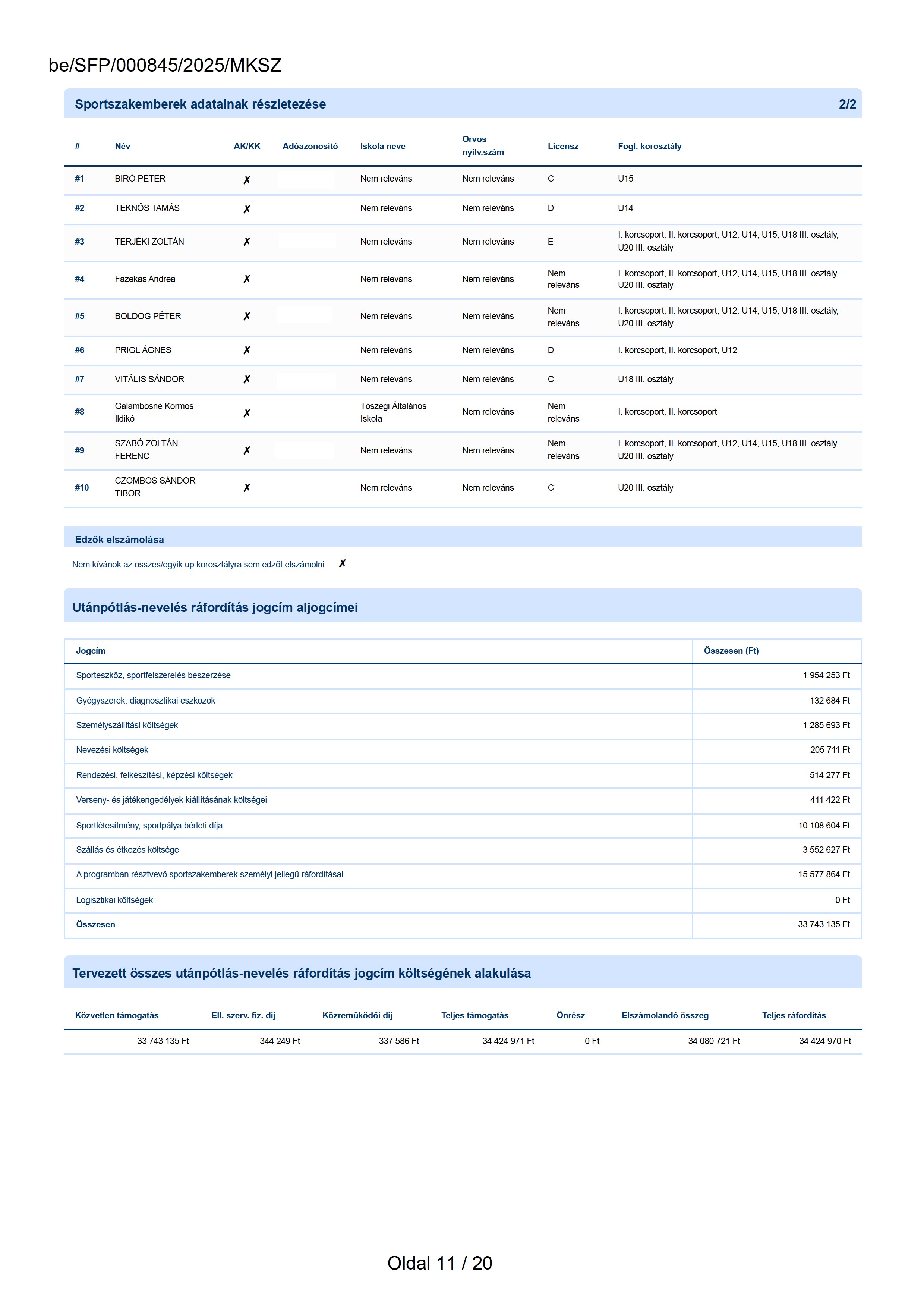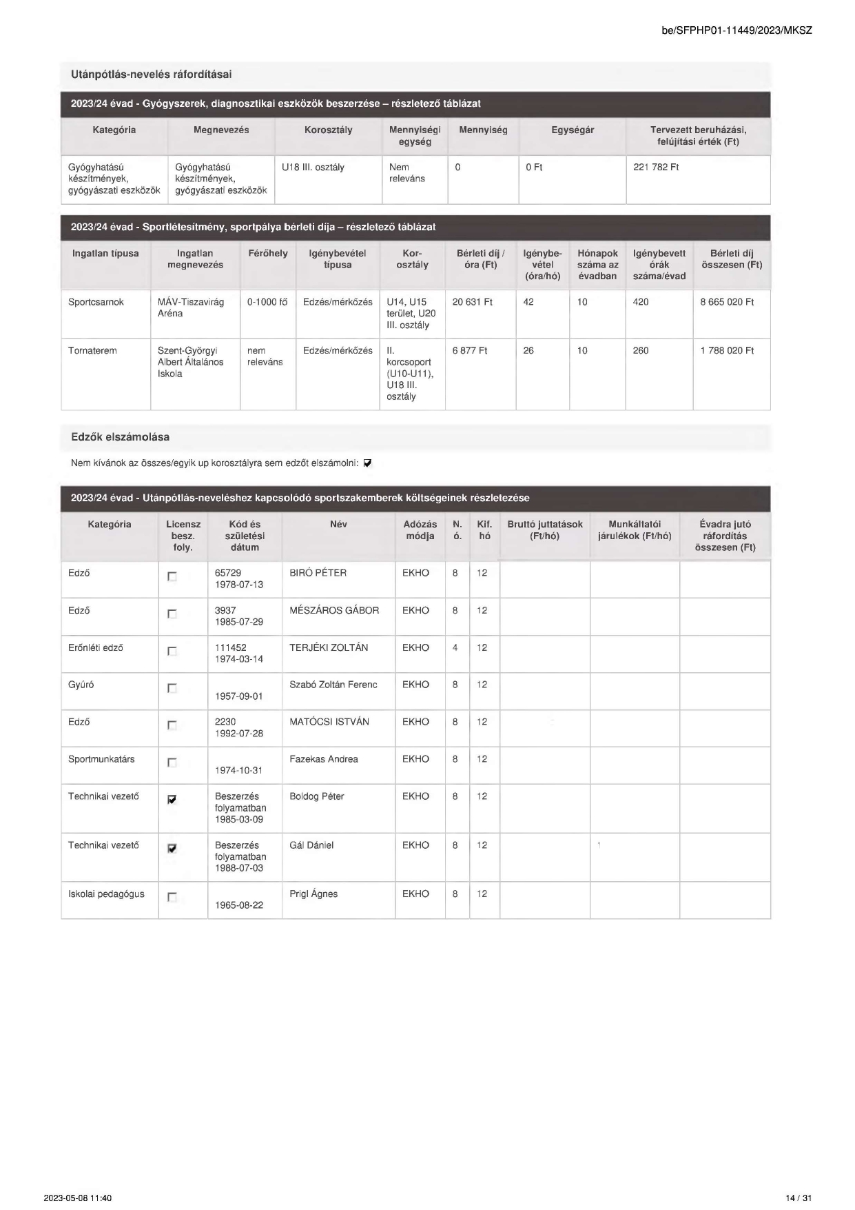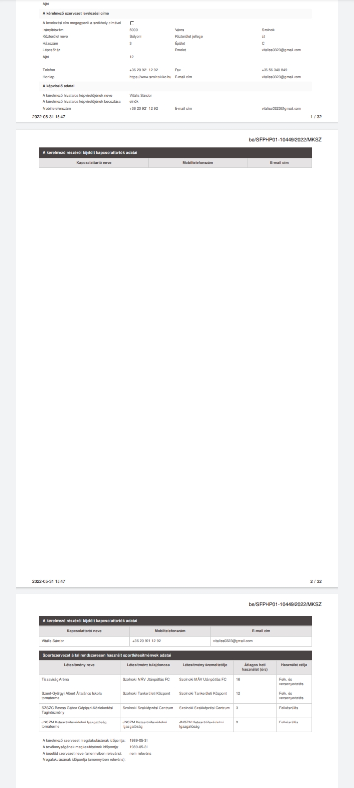 A támogatási igazolás kiállításának feltételét képező sportfejlesztési program jóváhagyására irányuló eljárással kapcsolatban a Szolnoki Kézilabda Club Sportegyesület kérelmező (5000 Szolnok Pipacs u. 10-12., adószáma: 19866767 - 1 - 16, képviselője: Vitális Sándor) sportfejlesztési programjának szakmai tartalmát, illetve annak költségvetését a Kormányrendelet 4. §-ának (5) bekezdése, valamint a sportfejlesztési programban rendelkezésre álló információk alapján jogcímenként az alábbi összegekben jóváhagyta: