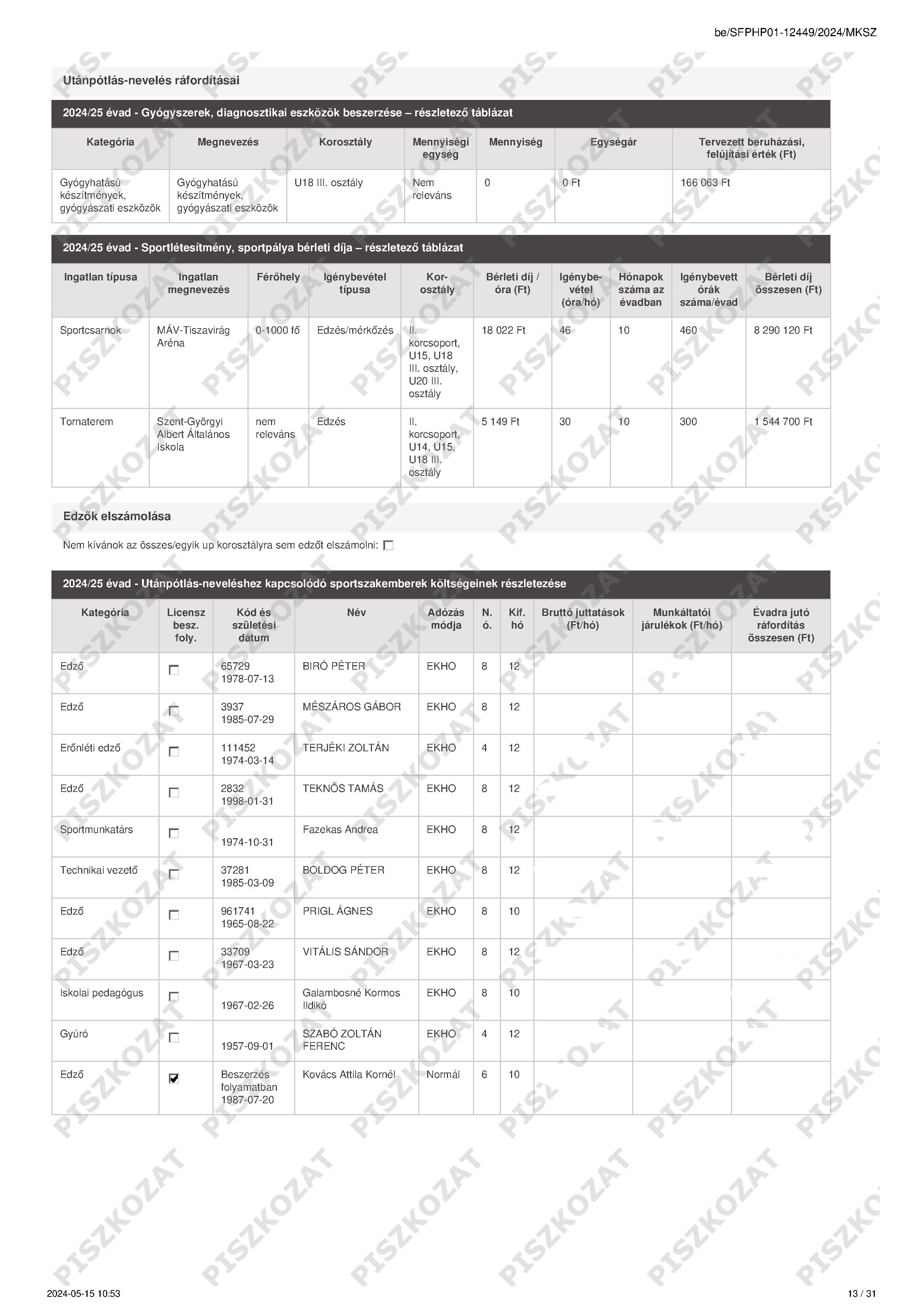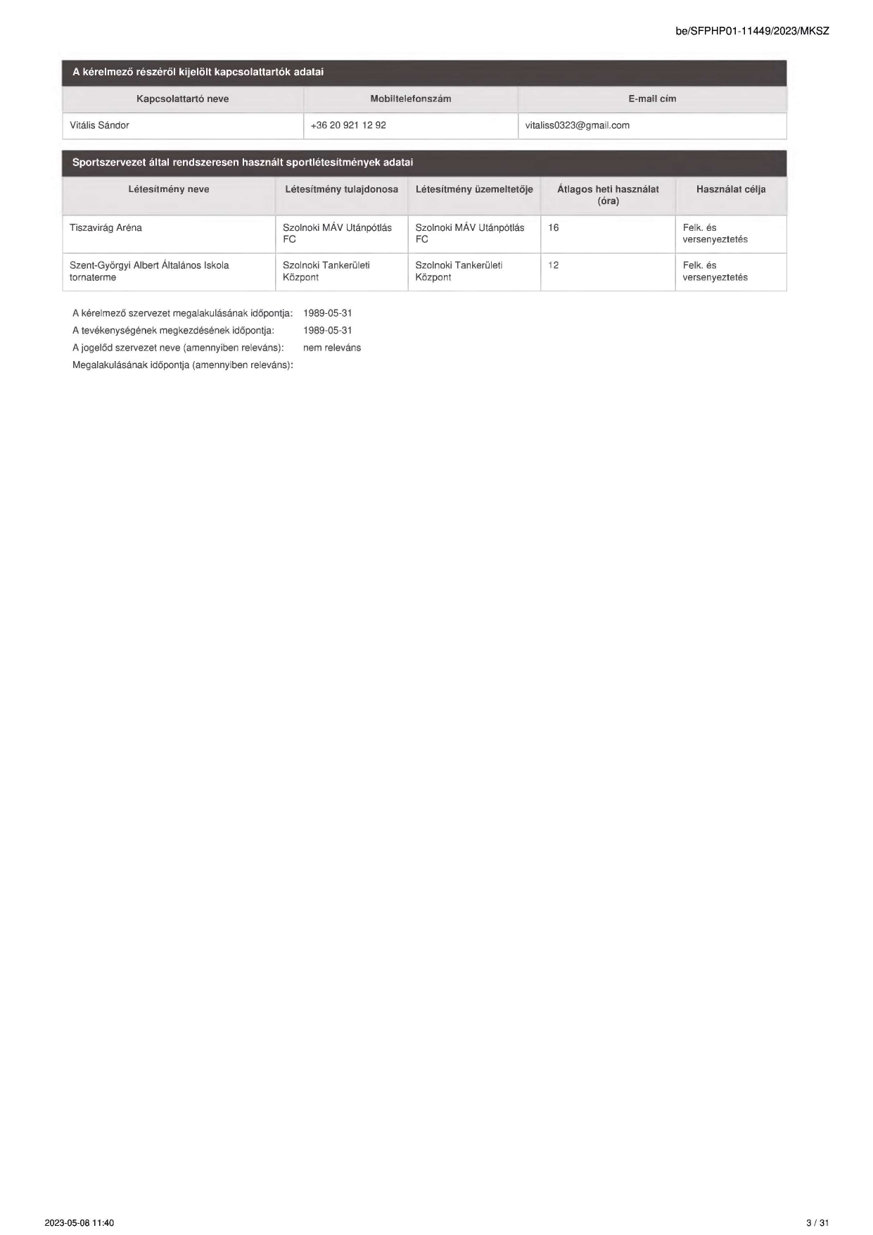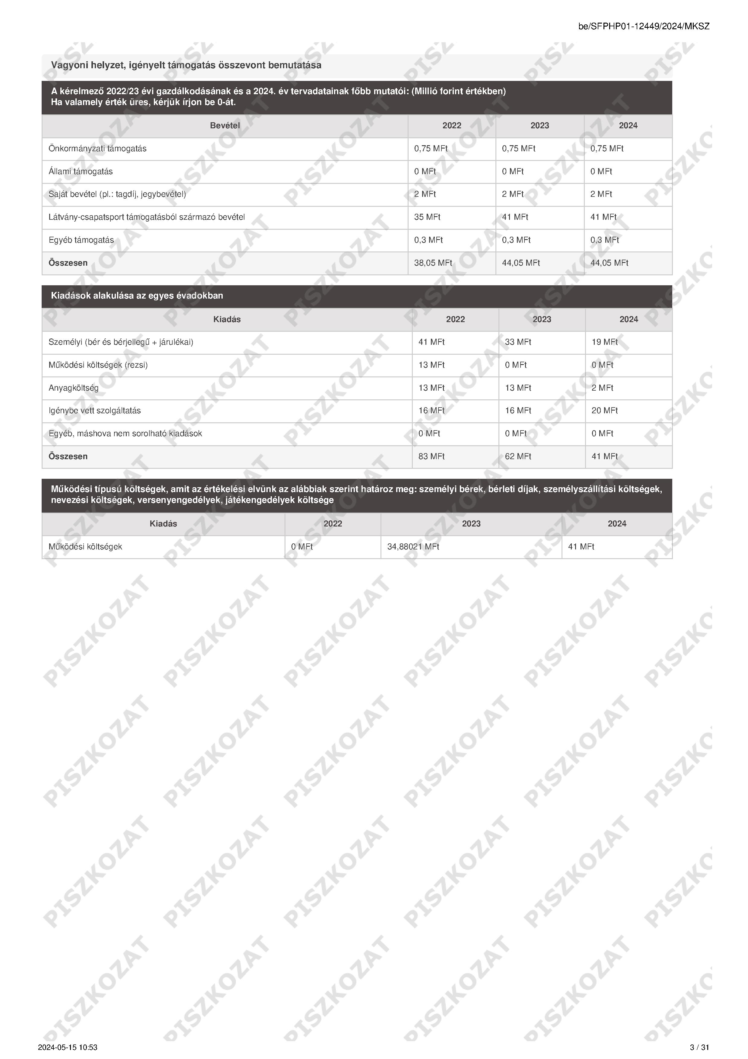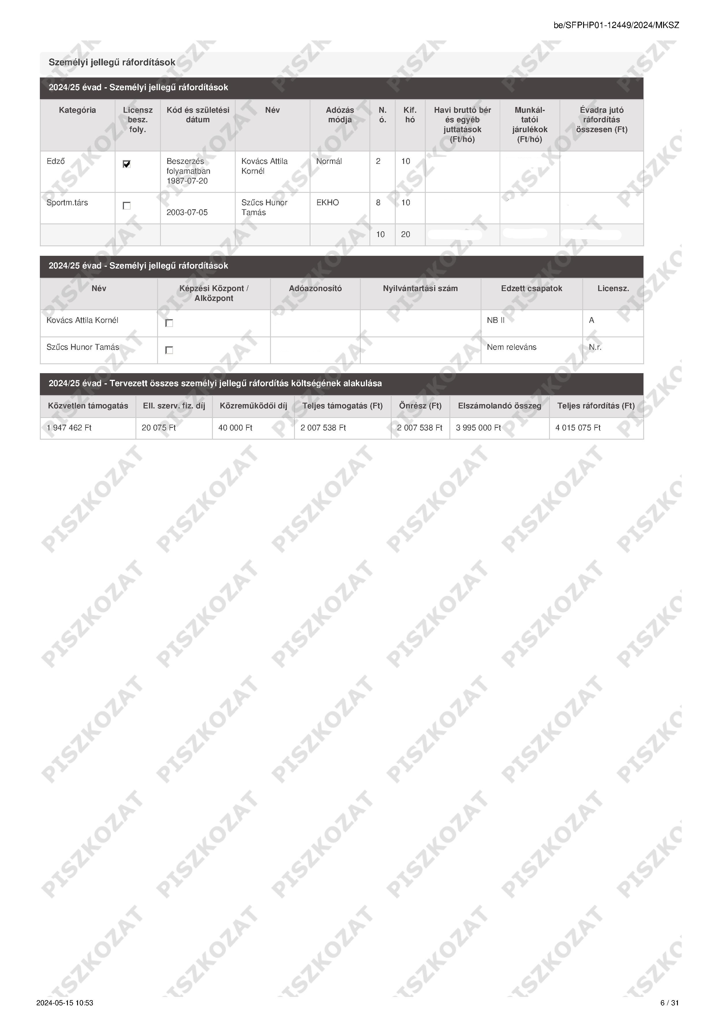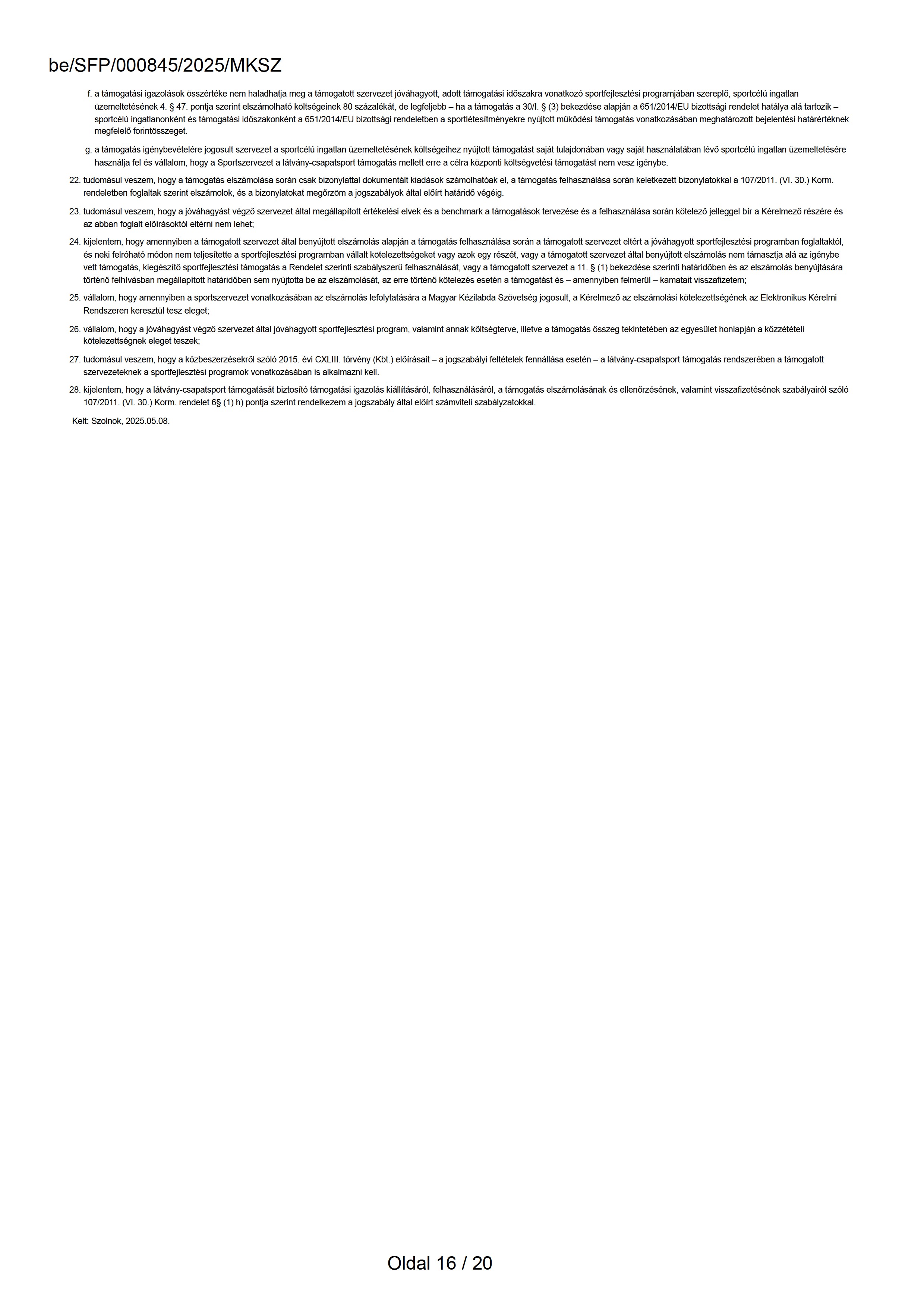 A támogatási igazolás kiállításának feltételét képező sportfejlesztési program jóváhagyására irányuló eljárással kapcsolatban a Szolnoki Kézilabda Club Sportegyesület kérelmező (5000 Szolnok Pipacs u. 10-12., adószáma: 19866767 - 1 - 16, képviselője: Vitális Sándor) sportfejlesztési programjának szakmai tartalmát, illetve annak költségvetését a Kormányrendelet 4. §-ának (5) bekezdése, valamint a sportfejlesztési programban rendelkezésre álló információk alapján jogcímenként az alábbi összegekben jóváhagyta: