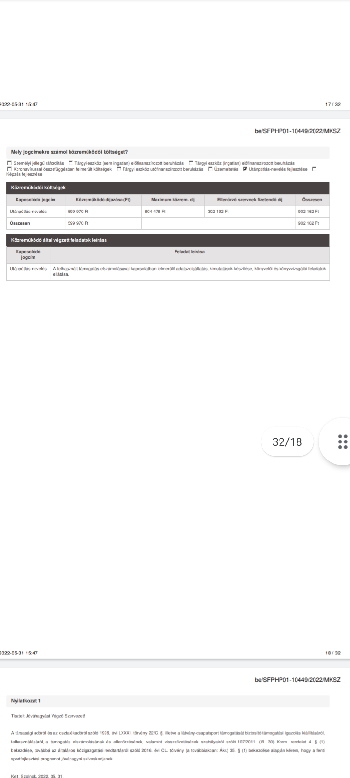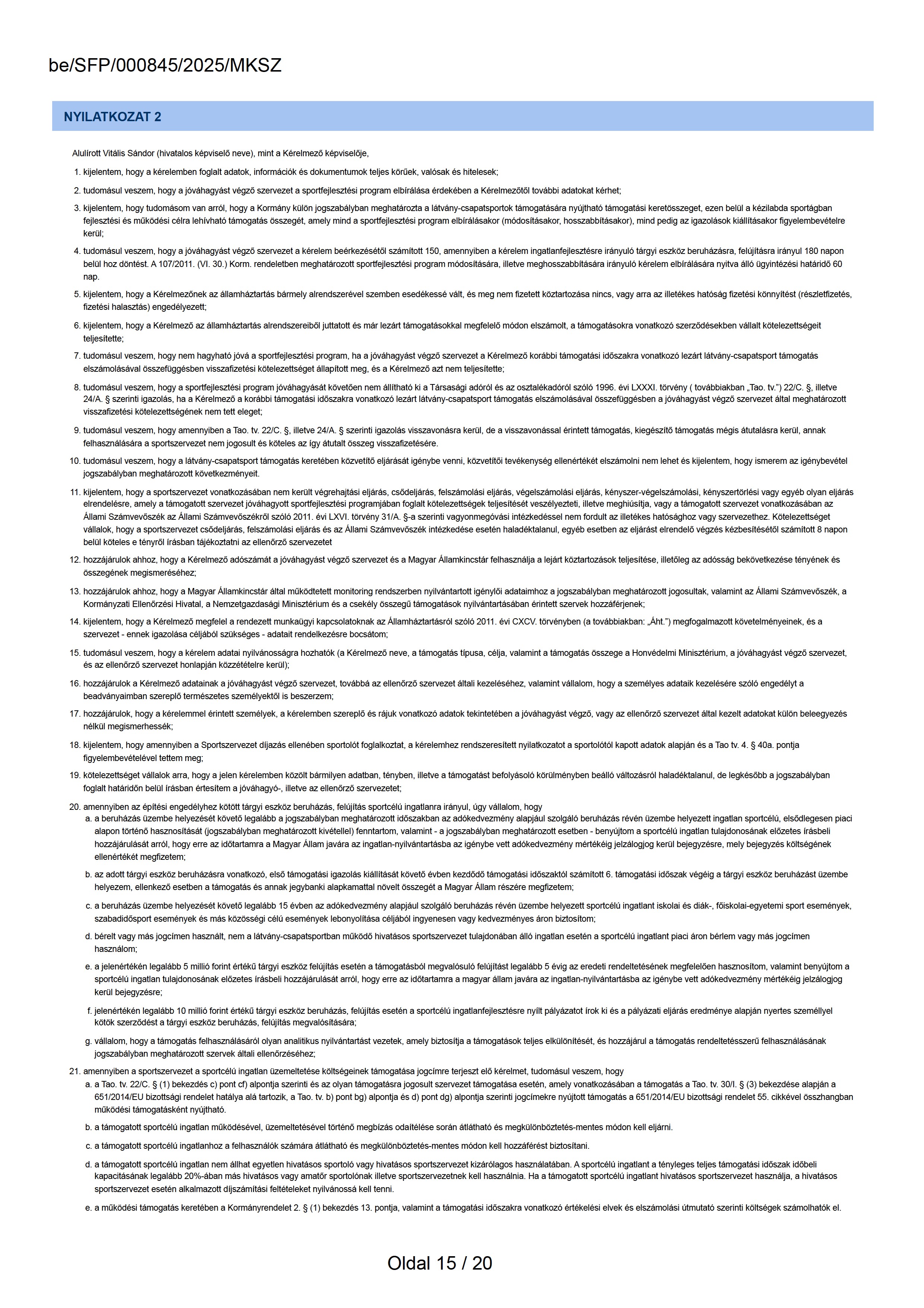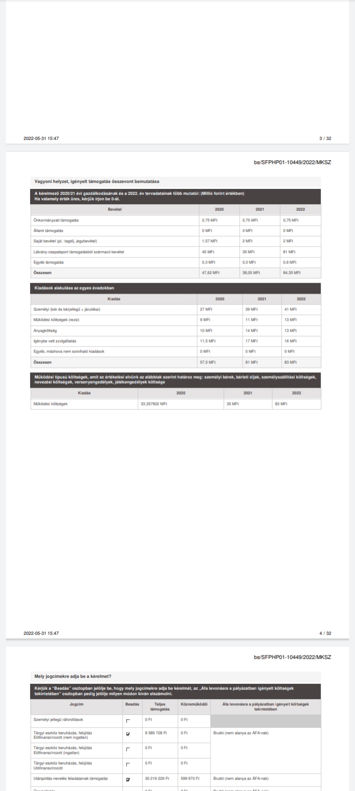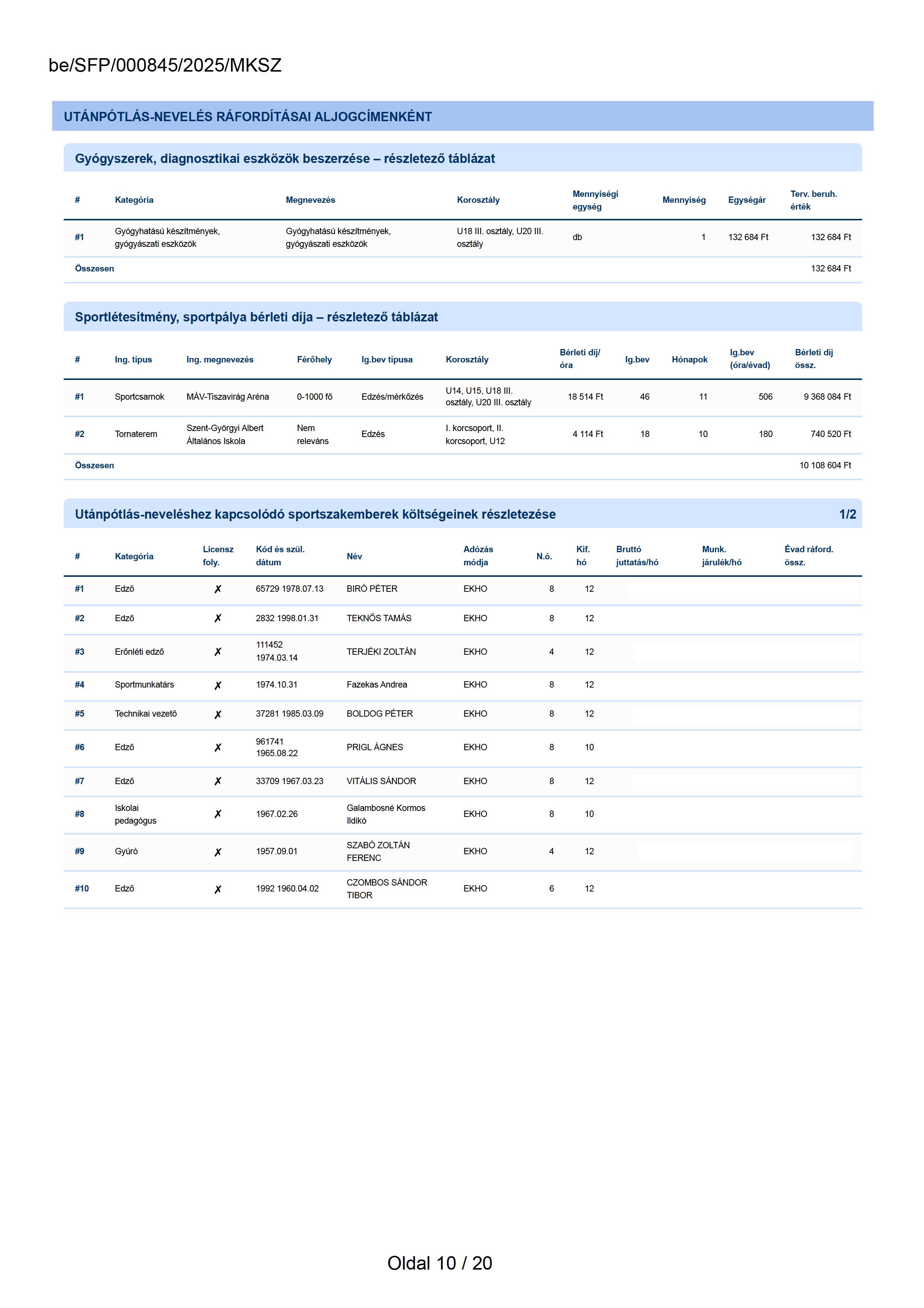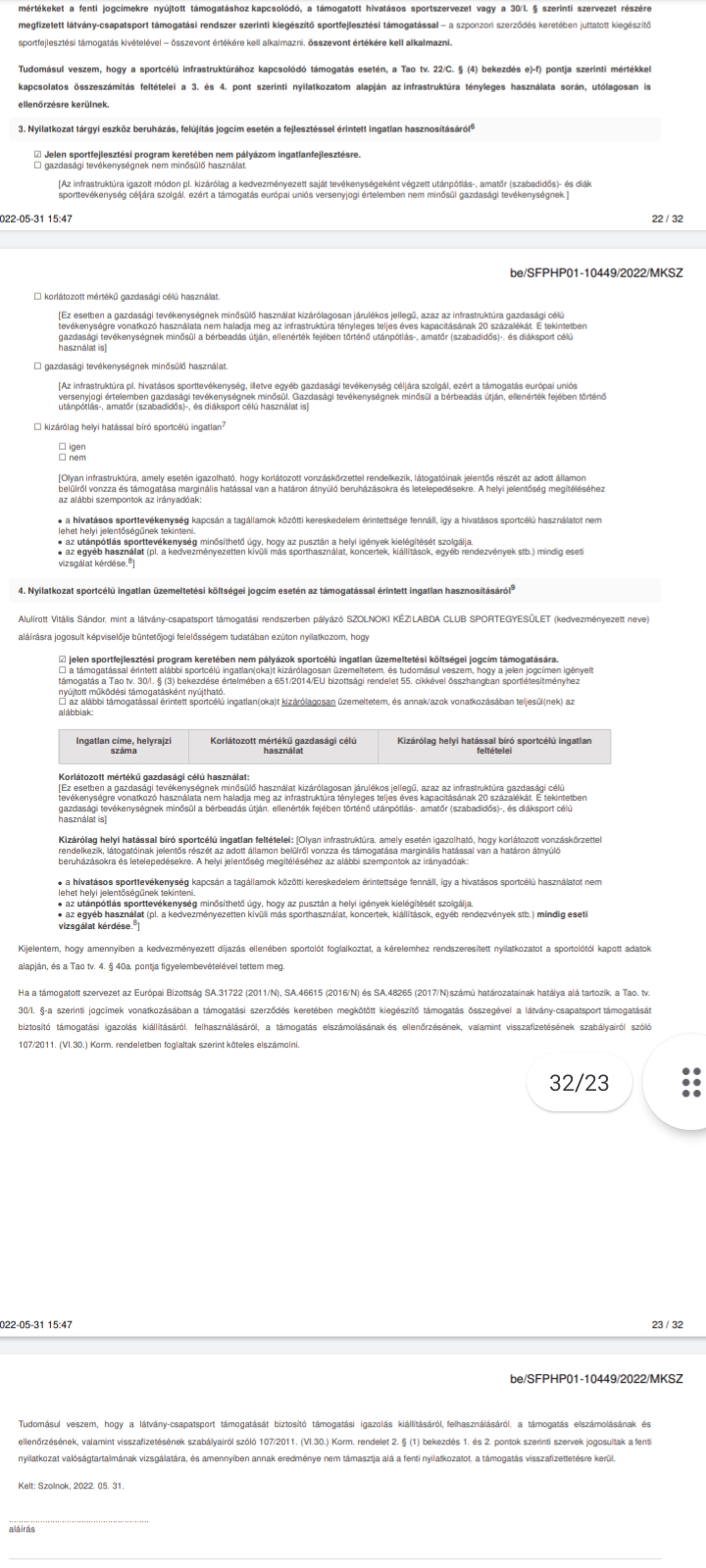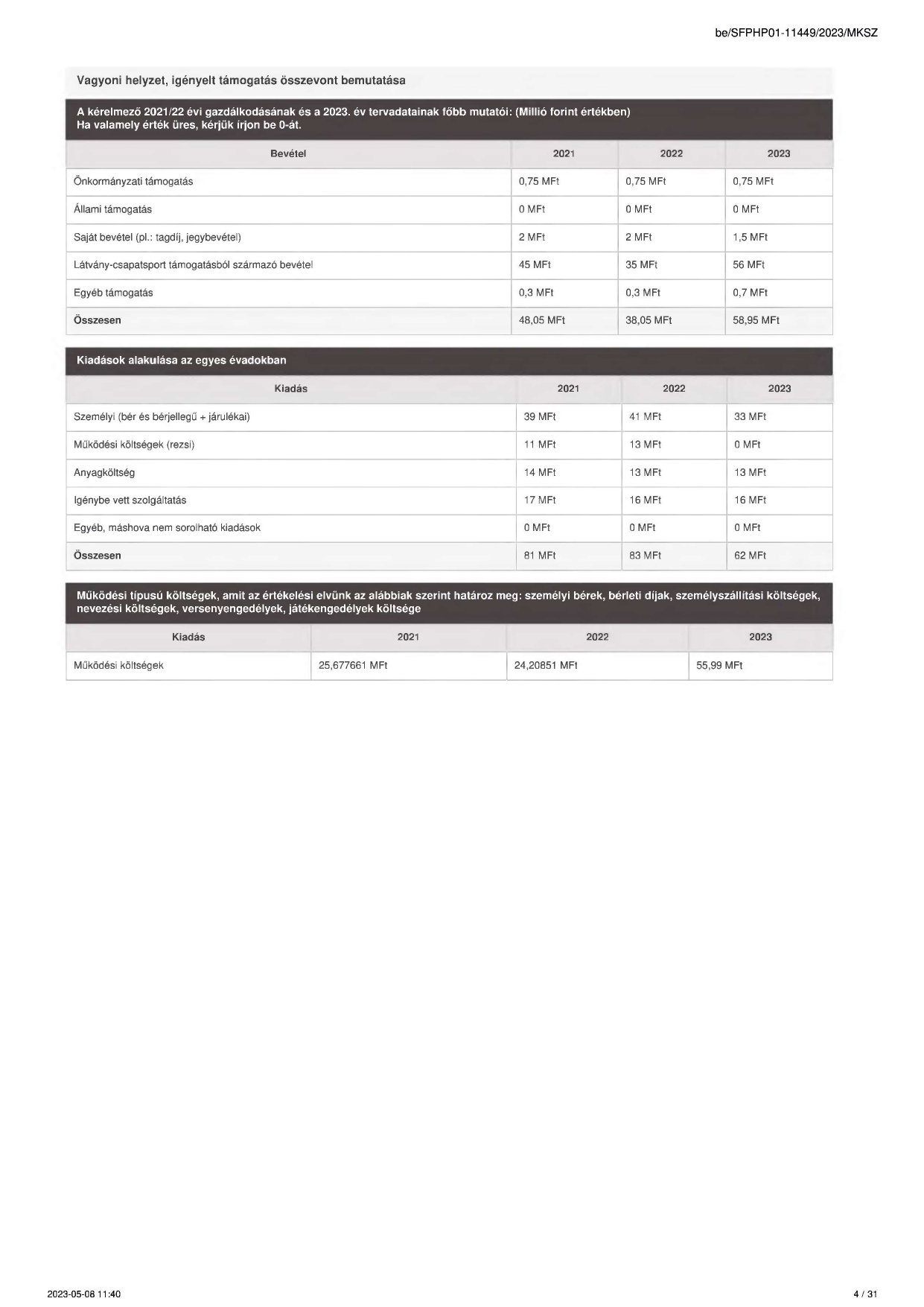 A támogatási igazolás kiállításának feltételét képező sportfejlesztési program jóváhagyására irányuló eljárással kapcsolatban a Szolnoki Kézilabda Club Sportegyesület kérelmező (5000 Szolnok Pipacs u. 10-12., adószáma: 19866767 - 1 - 16, képviselője: Vitális Sándor) sportfejlesztési programjának szakmai tartalmát, illetve annak költségvetését a Kormányrendelet 4. §-ának (5) bekezdése, valamint a sportfejlesztési programban rendelkezésre álló információk alapján jogcímenként az alábbi összegekben jóváhagyta: