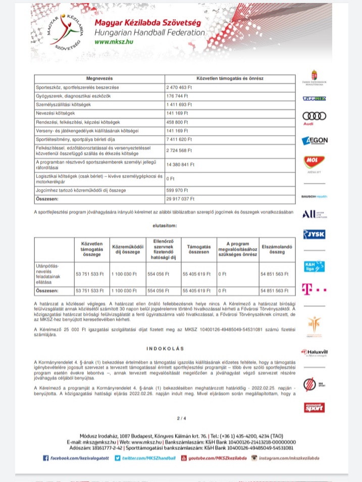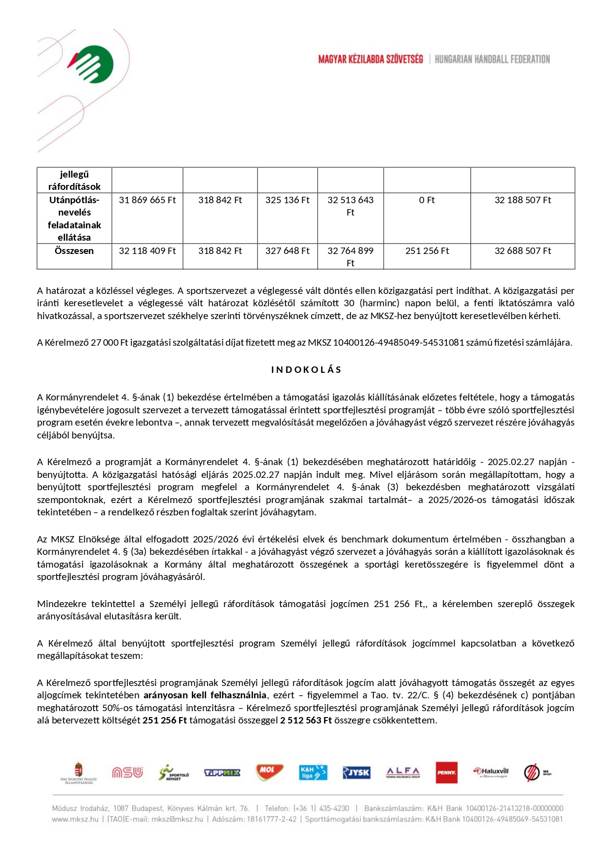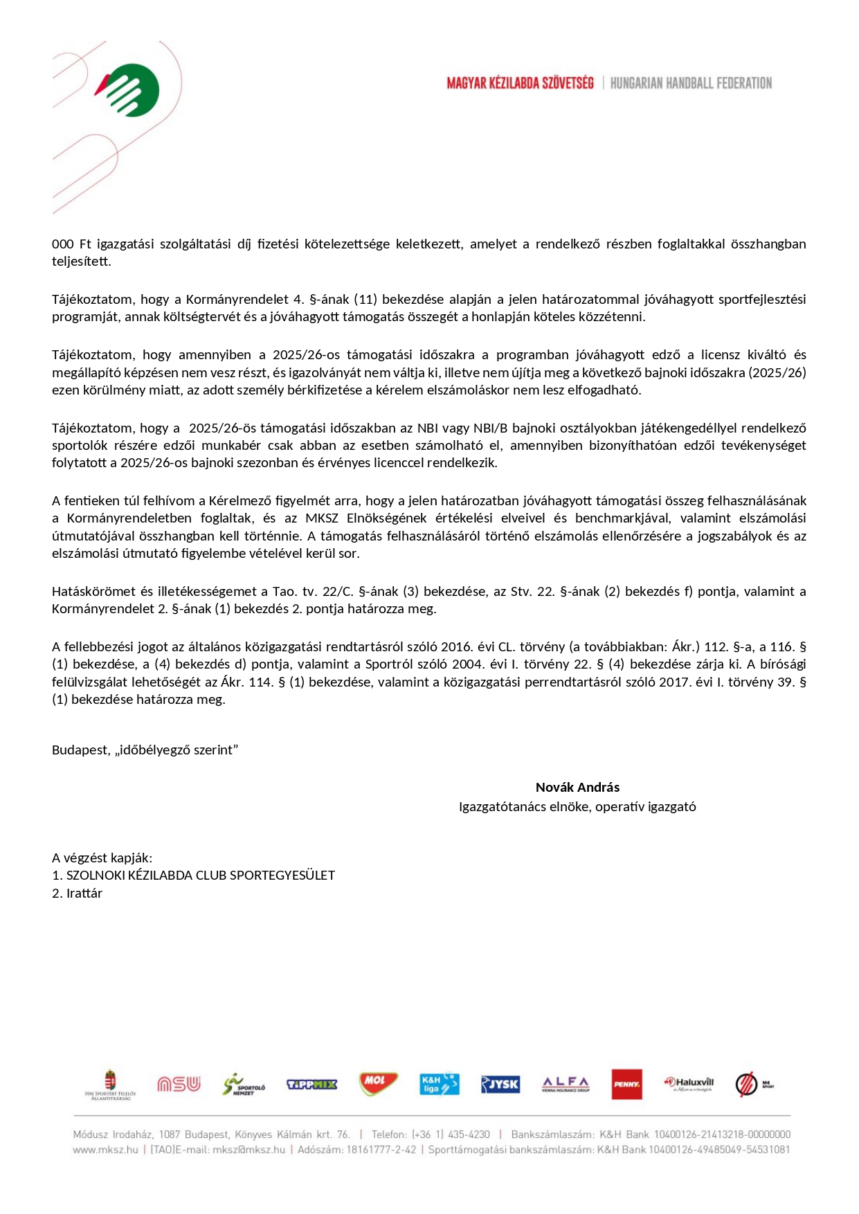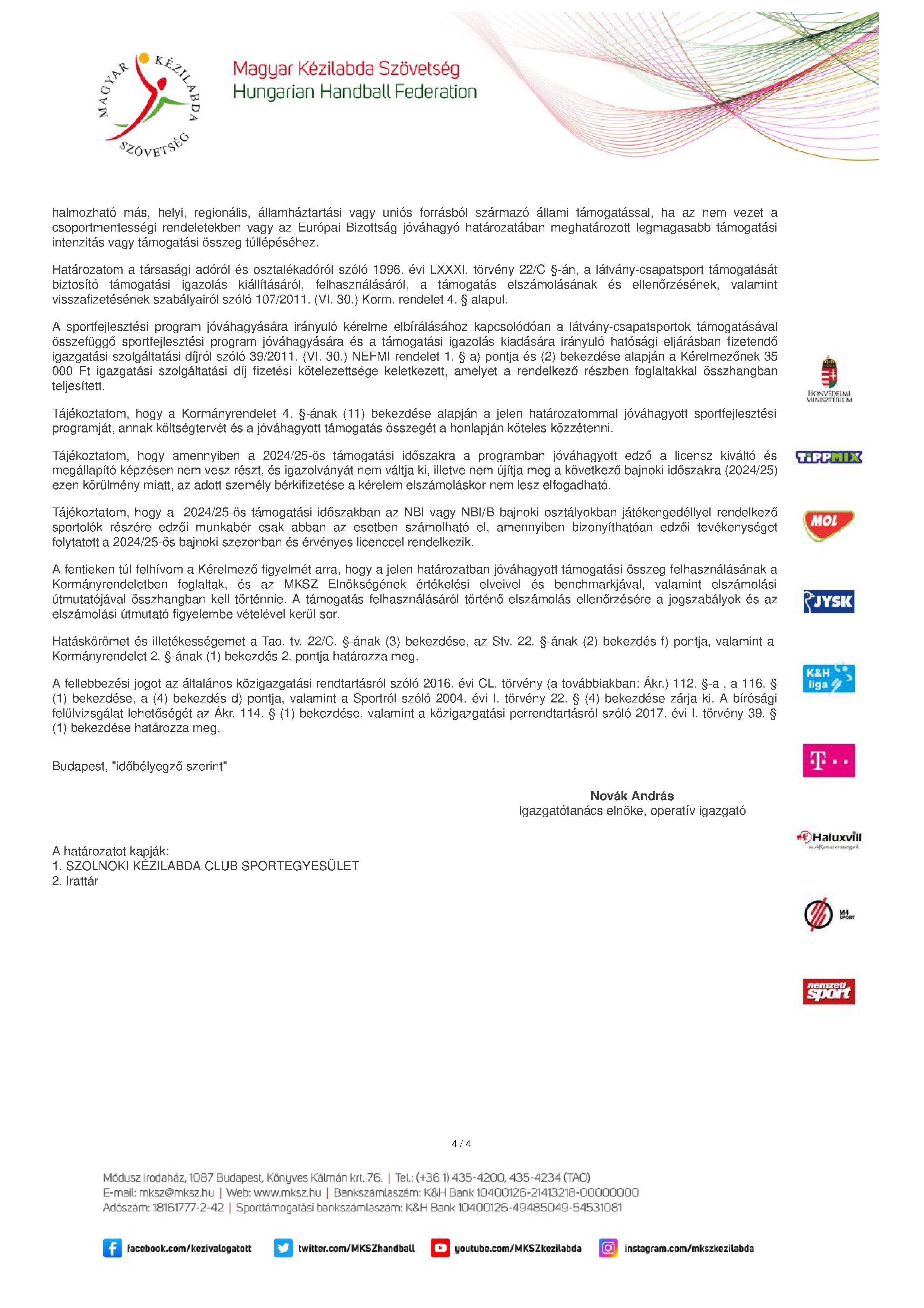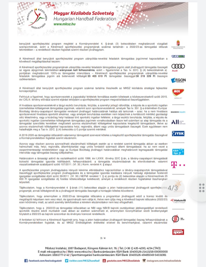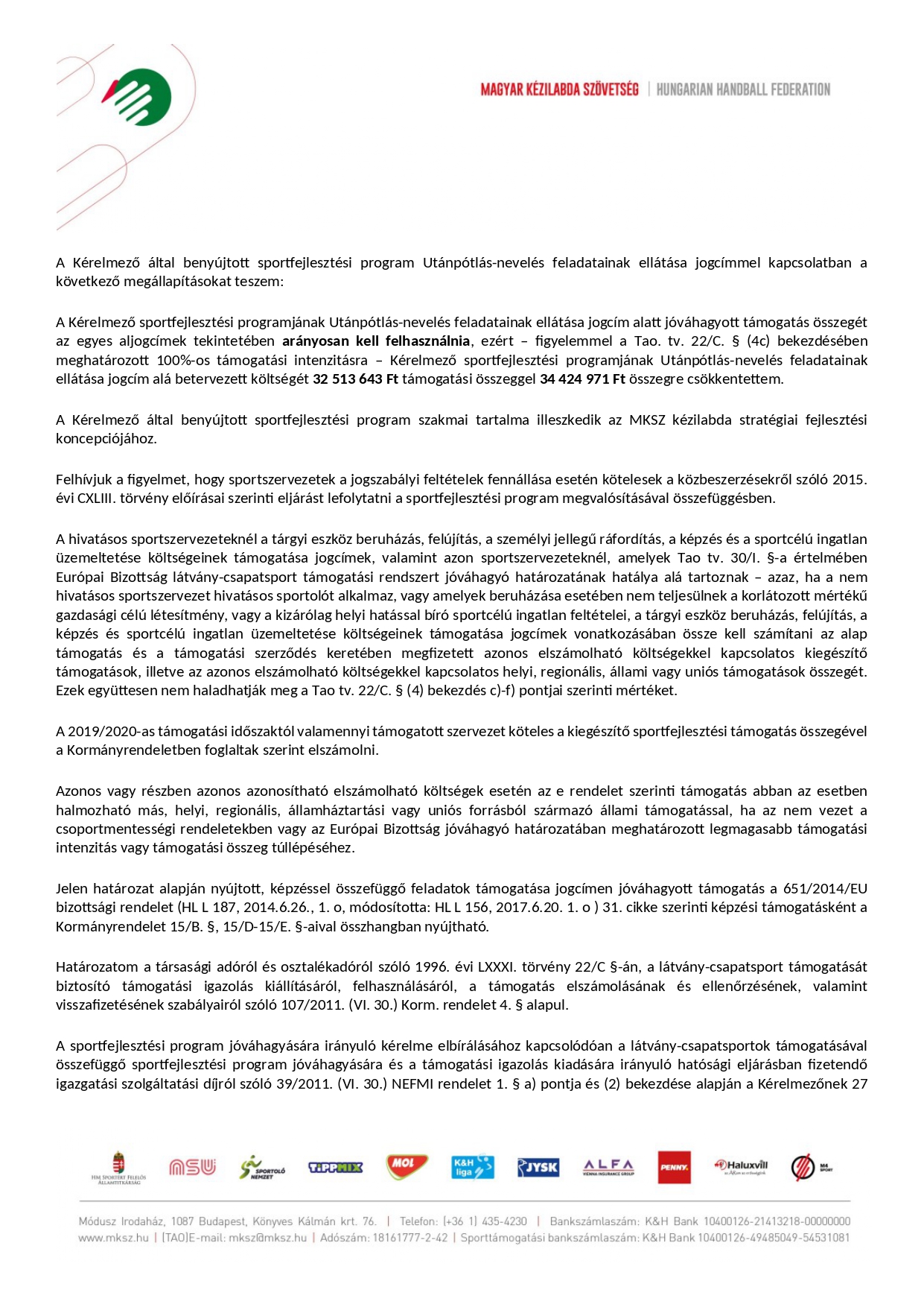 A Magyar Kézilabda Szövetség a közigazgatási hatósági eljárás és szolgáltatás általános szabályairól szóló 2004. évi CXL. 71. §-ának (1) bekezdése, a sportról szóló 2004. évi I. törvény 22. § (2) bekezdésének fa) pontja, a társasági adóról és az osztalékadóról szóló 1996. évi LXXXI. törvény 22/C. §-a, valamint a látvány-csapatsport támogatását biztosító támogatási igazolás kiállításáról, felhasználásáról, a támogatás elszámolásának és ellenőrzésének, valamint visszafizetésének szabályairól szóló 107/2011 (VI.30.) Korm. rendelet 4. §-ának (5) bekezdése alapján a következő határozat született.