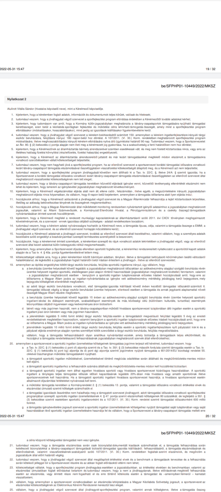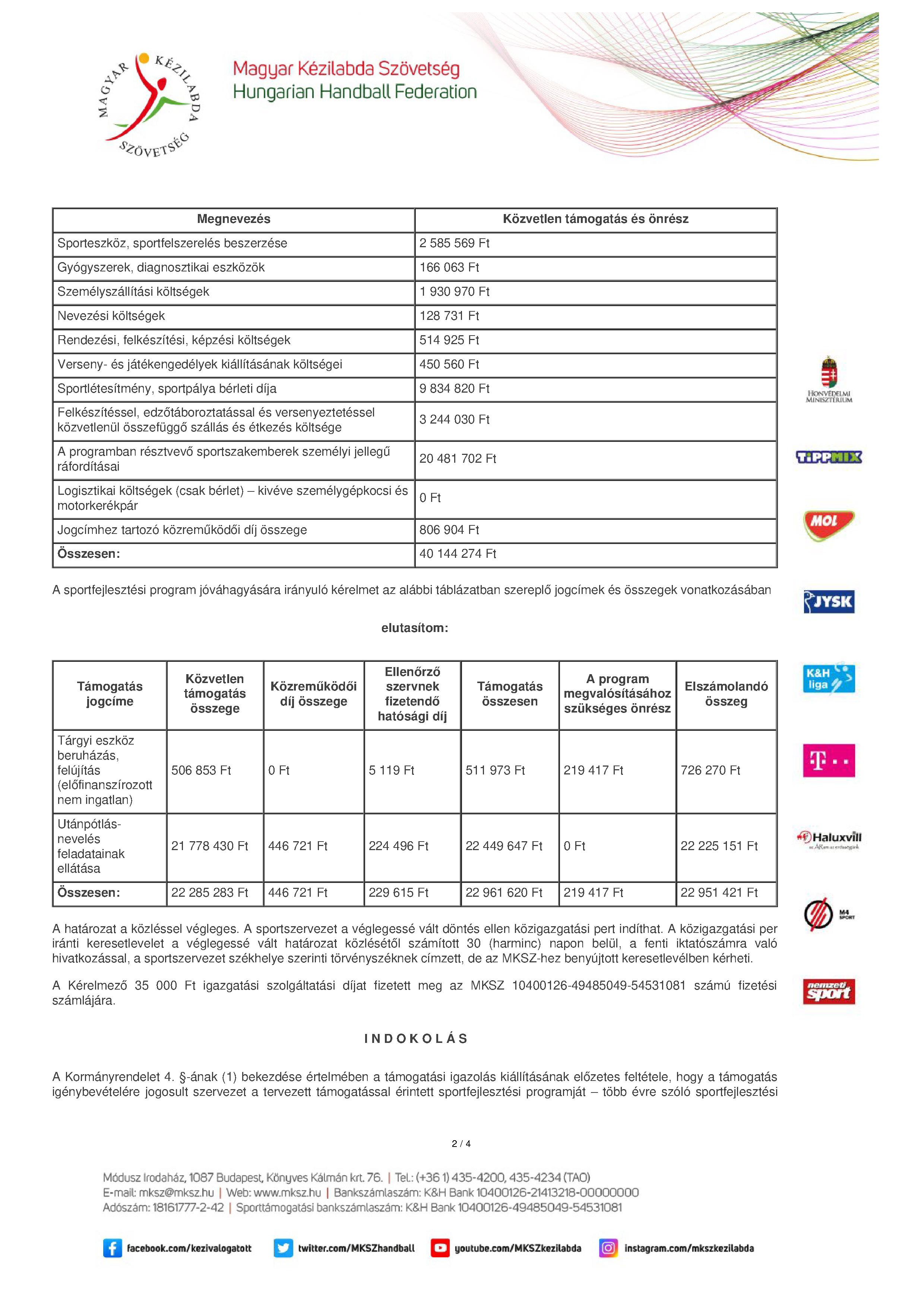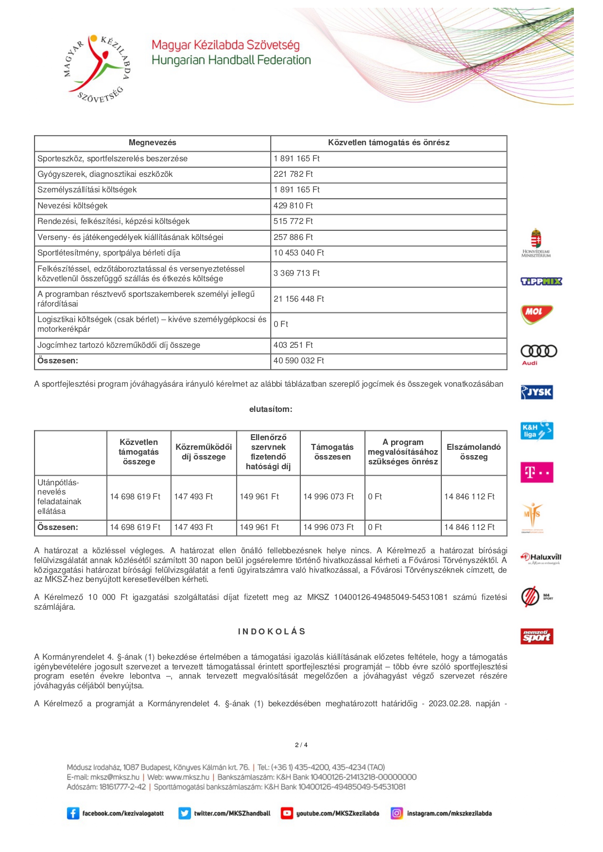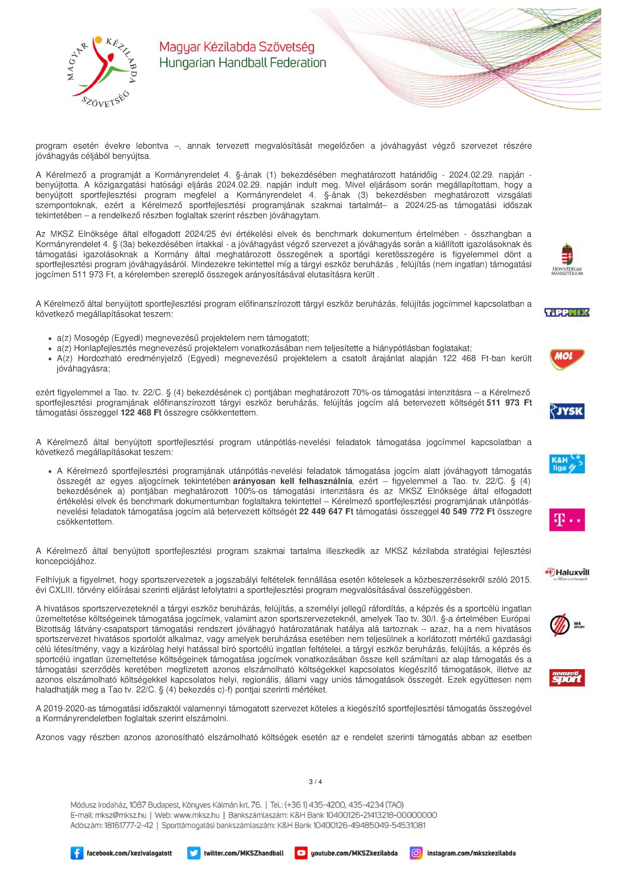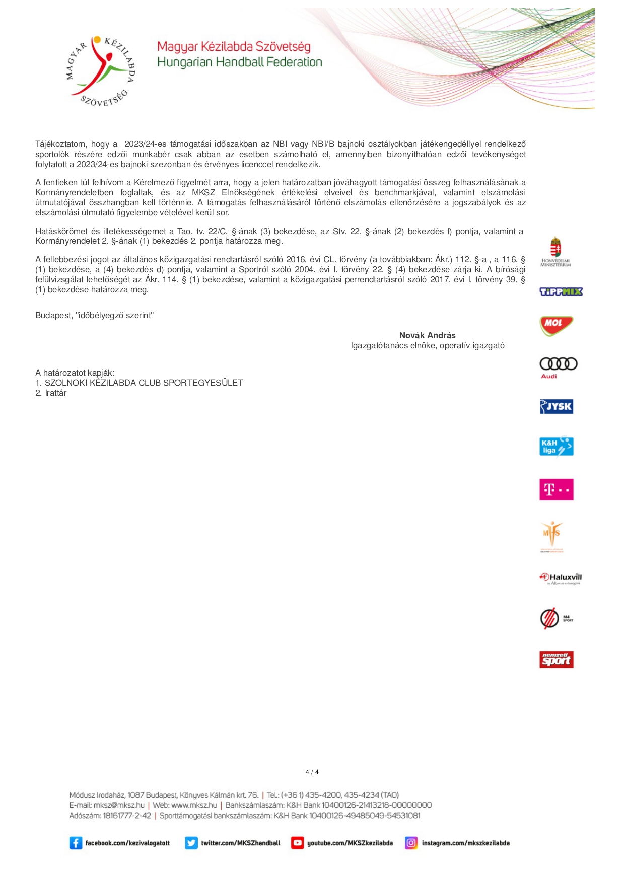 A Magyar Kézilabda Szövetség a közigazgatási hatósági eljárás és szolgáltatás általános szabályairól szóló 2004. évi CXL. 71. §-ának (1) bekezdése, a sportról szóló 2004. évi I. törvény 22. § (2) bekezdésének fa) pontja, a társasági adóról és az osztalékadóról szóló 1996. évi LXXXI. törvény 22/C. §-a, valamint a látvány-csapatsport támogatását biztosító támogatási igazolás kiállításáról, felhasználásáról, a támogatás elszámolásának és ellenőrzésének, valamint visszafizetésének szabályairól szóló 107/2011 (VI.30.) Korm. rendelet 4. §-ának (5) bekezdése alapján a következő határozat született.